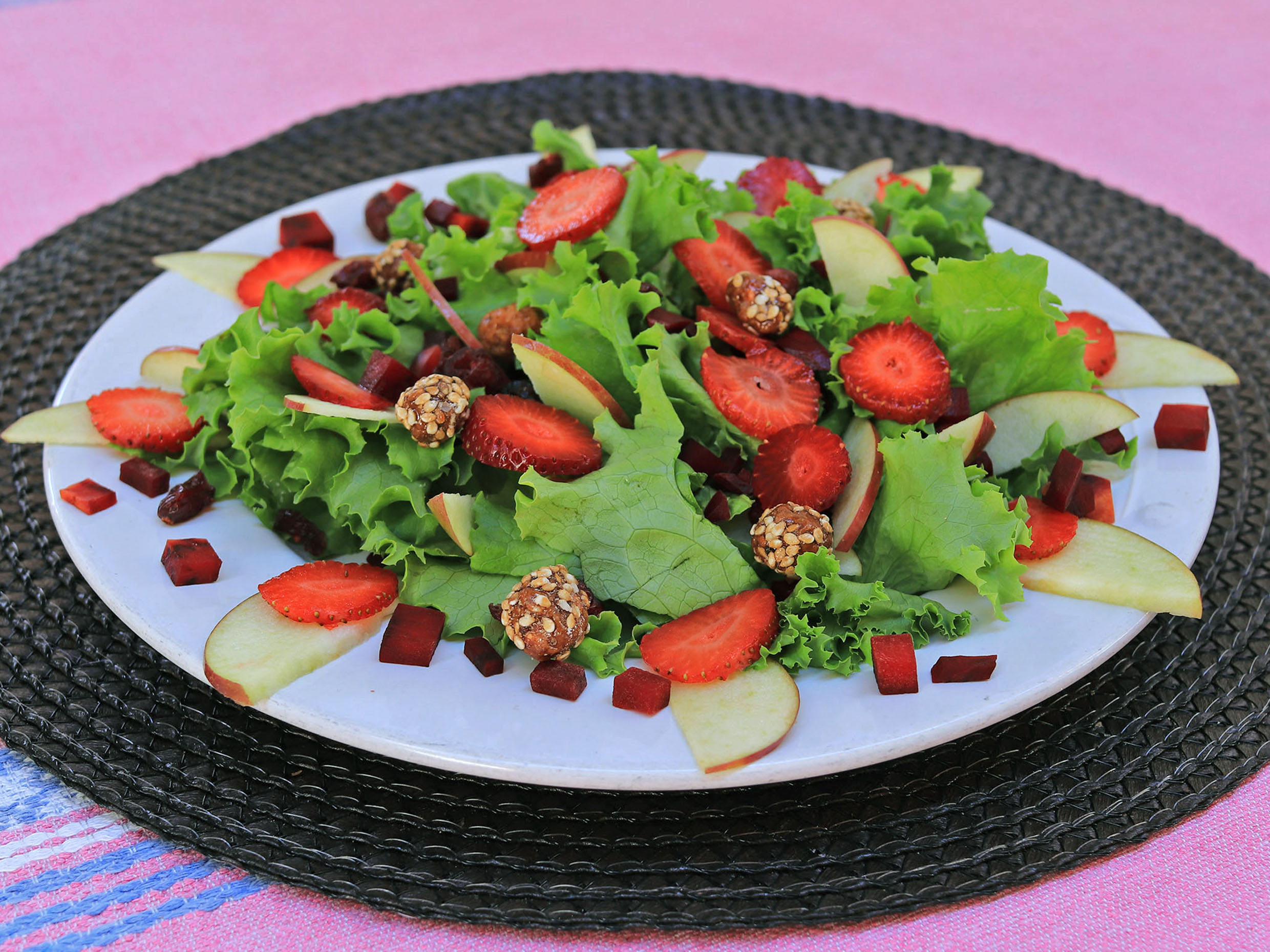 Base de lechuga, manzana, fresas, arándanos y trocitos de betabel, acompañada de aderezo.