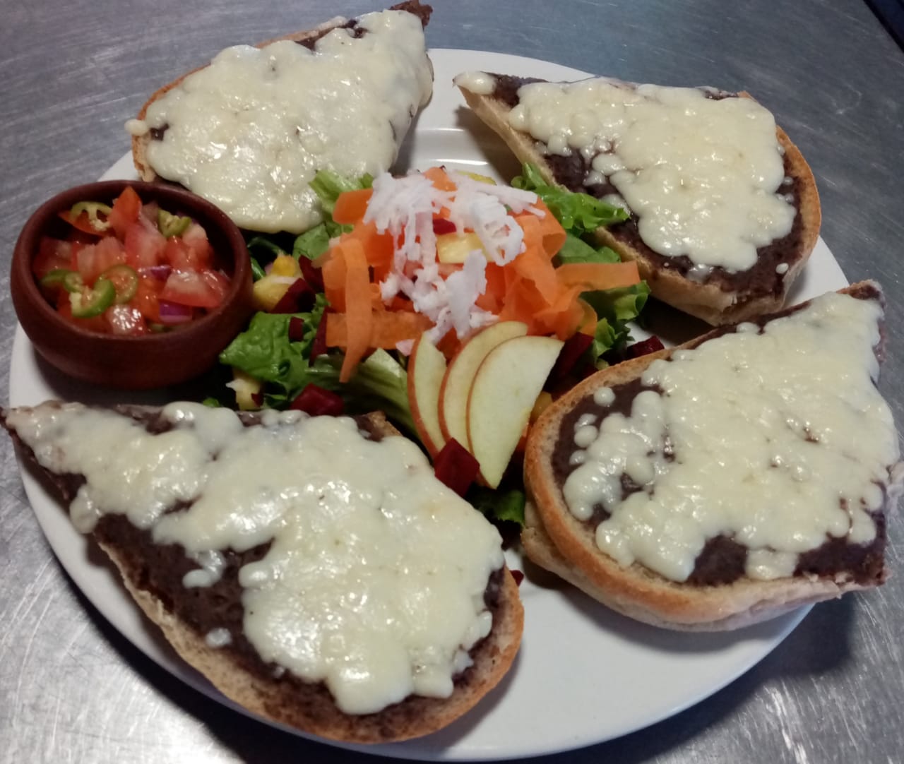 Delicioso pan artesanal bañado de frijol y queso mozzarella gratinado, acompañados de ensalada y pico de gallo, salsa y aderezo.