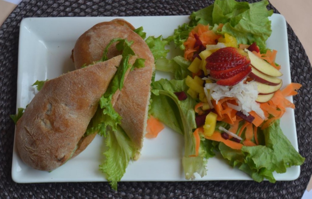 Pan ciabatta con filete mojarra acompañado de ensalada.