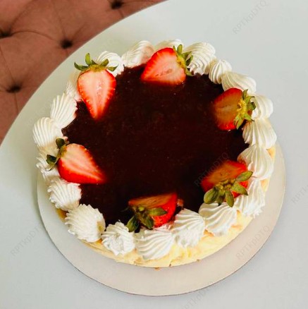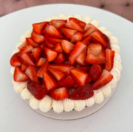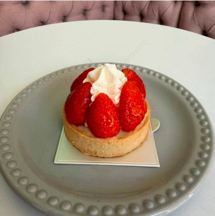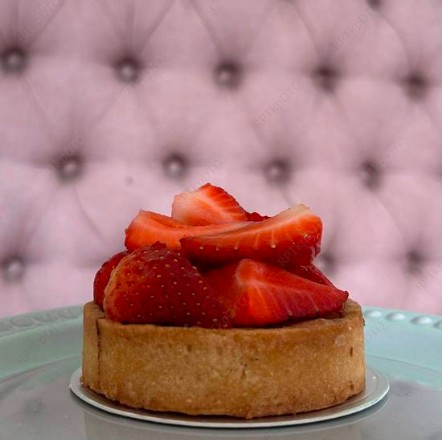 Individual, galleta de vainilla con capa de chocolate blanco, crema pastelera y topping de chantilly con fresas.