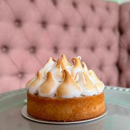 Individual, galleta de vainilla con núcleo de limón, cremoso de limón y toppings de merengue flameado.