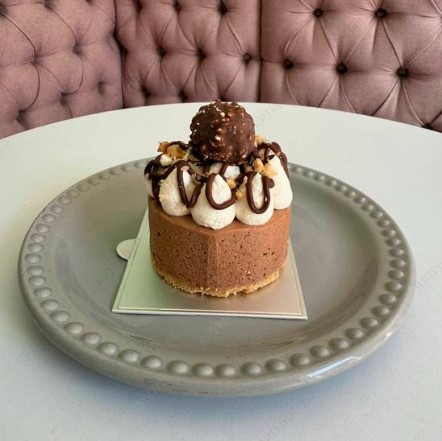 Cheesecake individual de chocolate con crema de avellanas, galleta de vainilla, topping de chantilly y Ferrero.