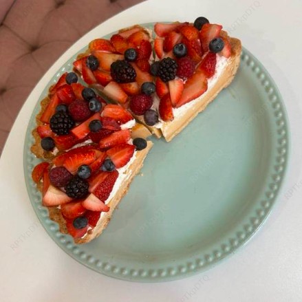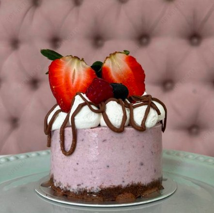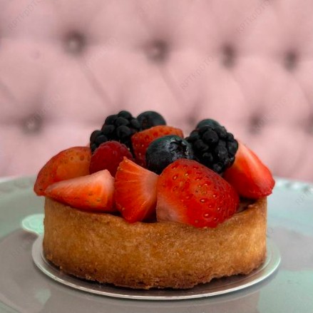 Individual, galleta de vainilla, relleno de crema inglesa de chocolate y toppings de frutos rojos.