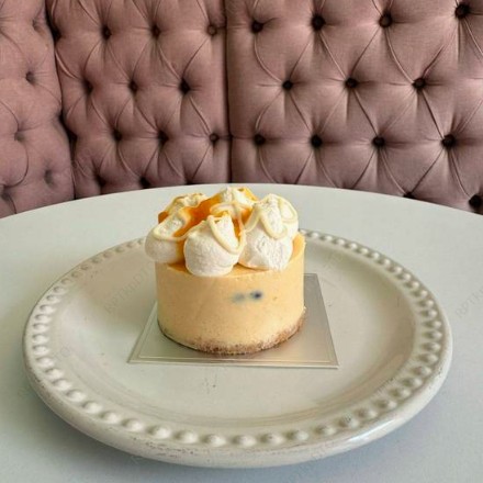 Cheesecake individual de maracuyá, galleta de vainilla, topping de chantilly y maracuyá.