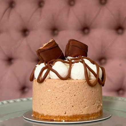 Cheesecake individual de chocolate con leche kinder, galleta de vainilla, topping de chantilly y kinder el kinder de topping varia.