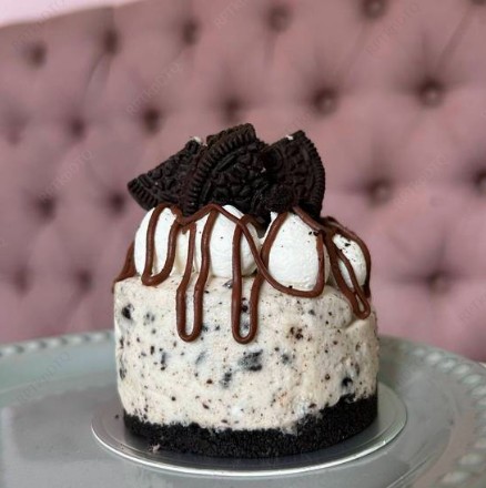 Cheesecake individual de oreo, galleta de chocolate, topping de chantilly y oreo.