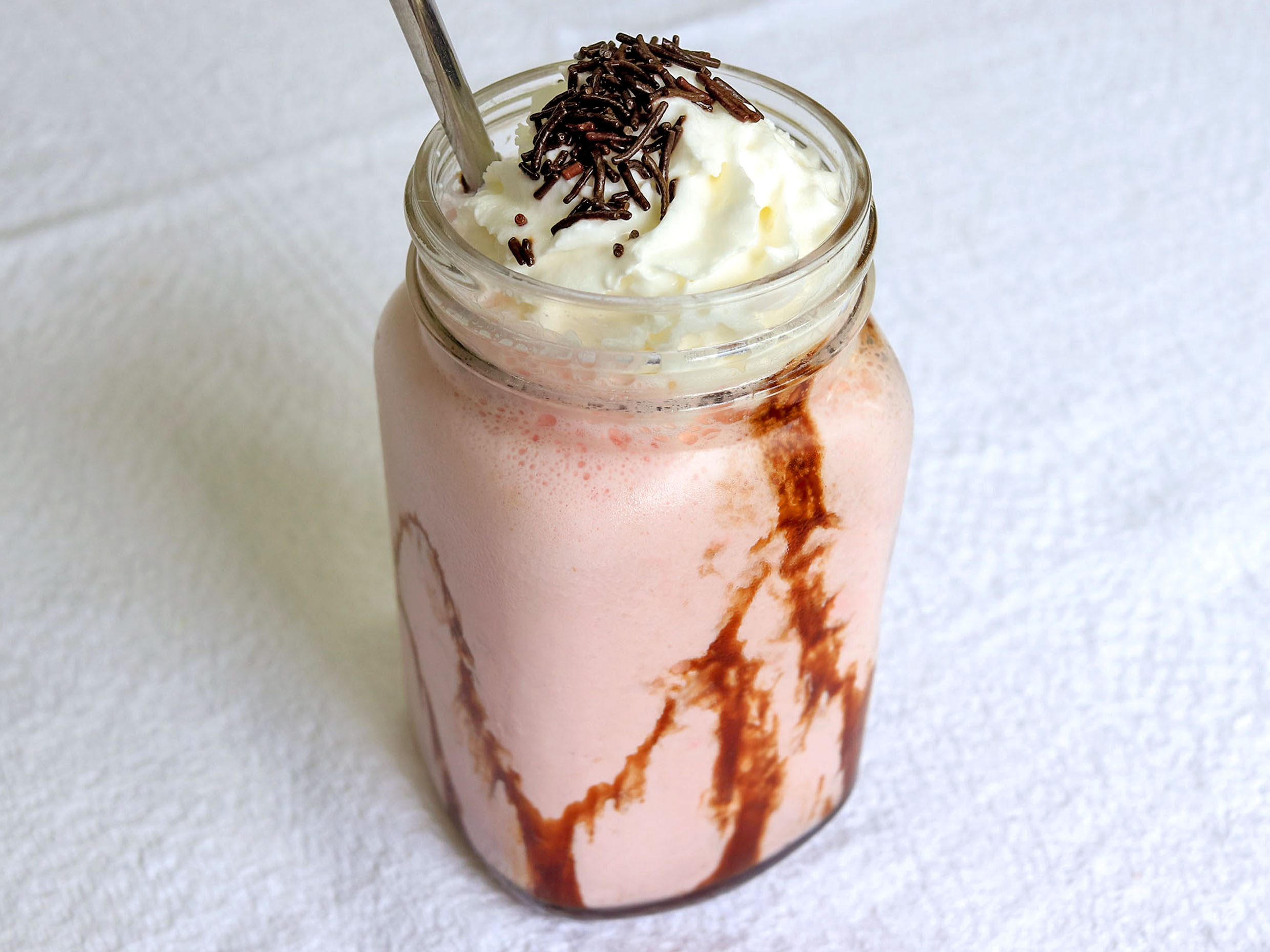 Helado de fresa, leche de su preferencia y vaso decorado con chocolate.