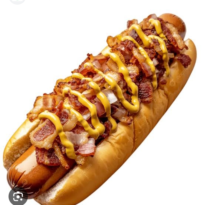 Salchicha envuelta con tocino, tomate, cebolla camarelizada y tocino extra.