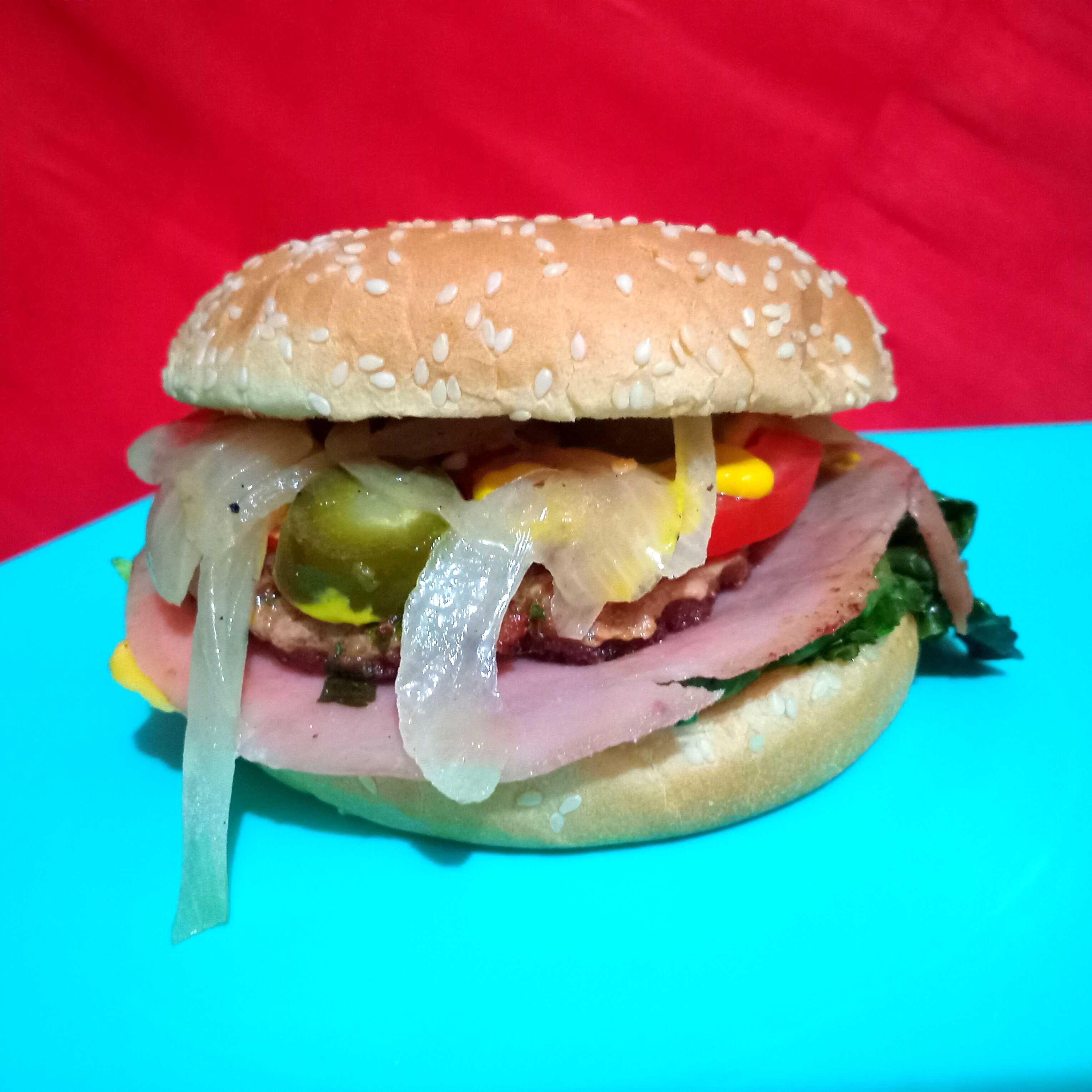 Hamburguesa clasica acompañado de tomate, cebolla, lechuga, queso americano y jamón (Incluye Media Orden de Papas a la Francesa)