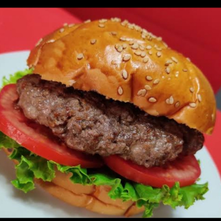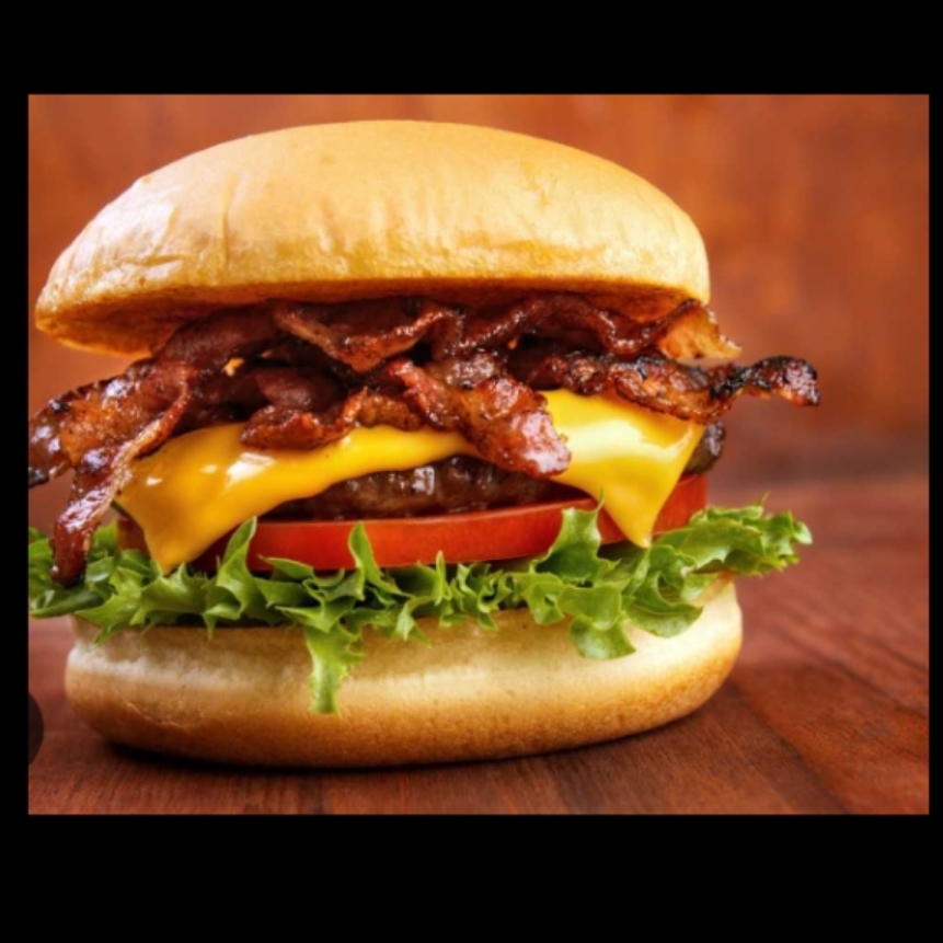 Hamburguesa con dos porciones de carne, acompañado de tomate, cebolla, lechuga, queso americano y jamón (Incluye Media Orden de Papas a la Francesa)