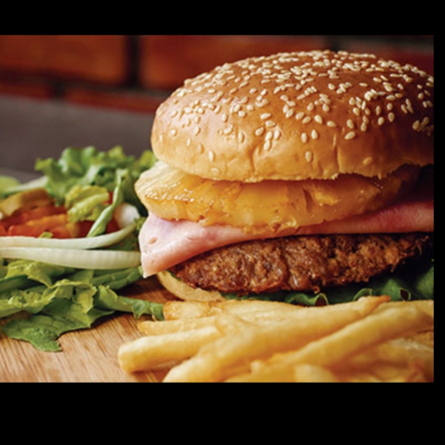 Hamburguesa con Lechuga, tomate, cebolla, jamón, queso americano y piña. (Incluye Media Orden de Papas a la Francesa)