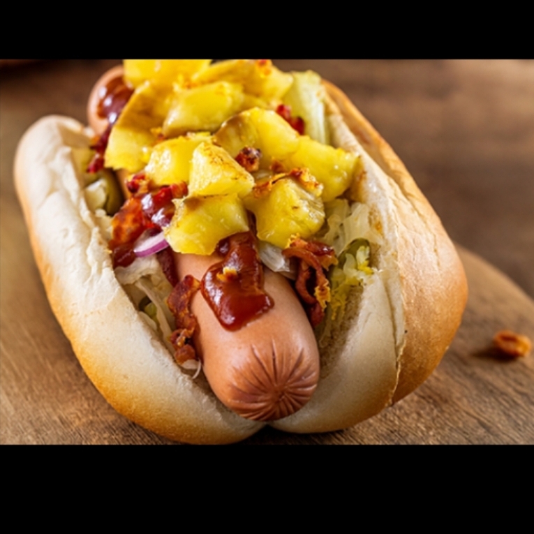 Salchicha envuelta en tocino, tomate, cebolla caramelizada y piña a la plancha.