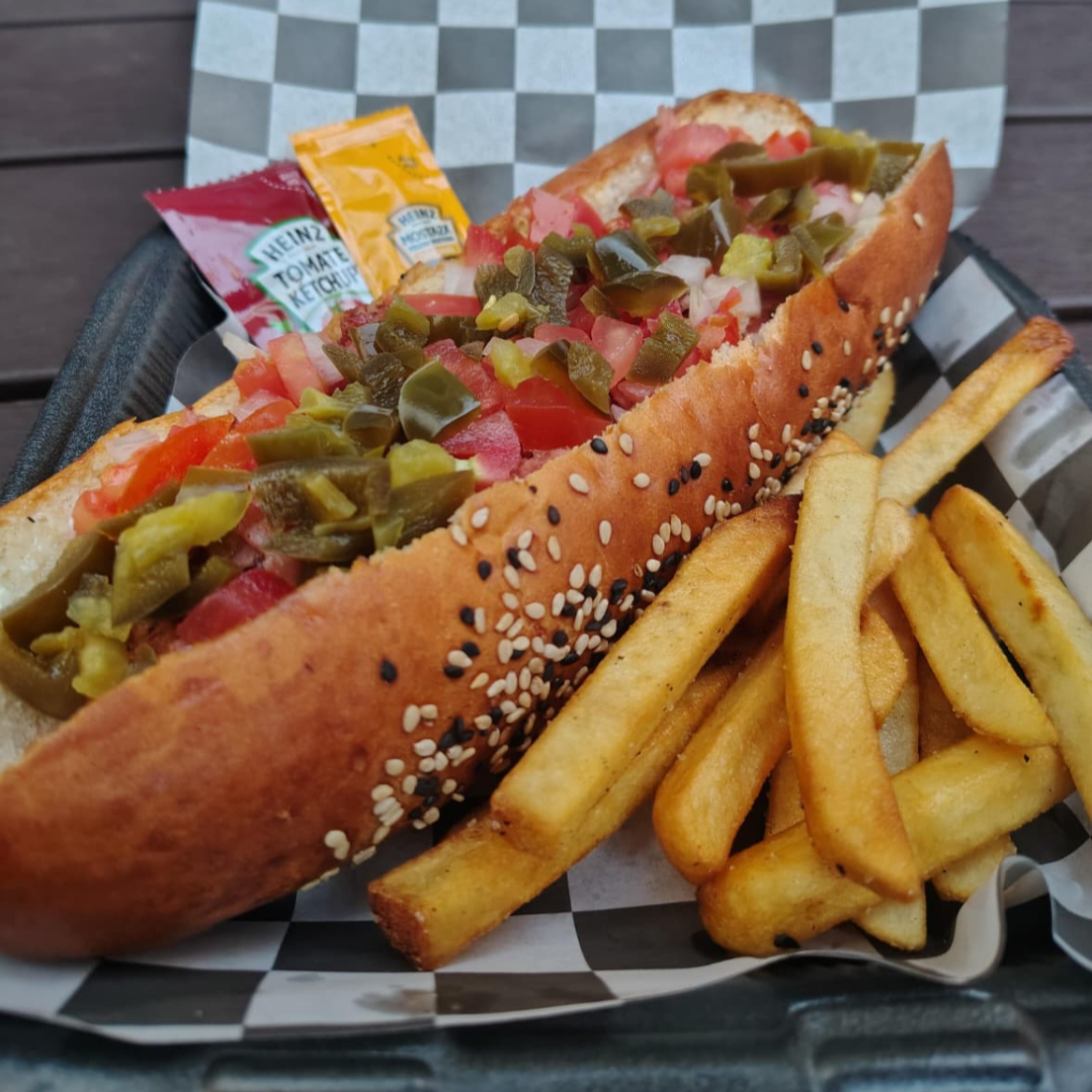 Pan artesanal, salchicha jumbo, tocino, cebolla, tomate, chiles en vinagre, acompañado de papas fritas.