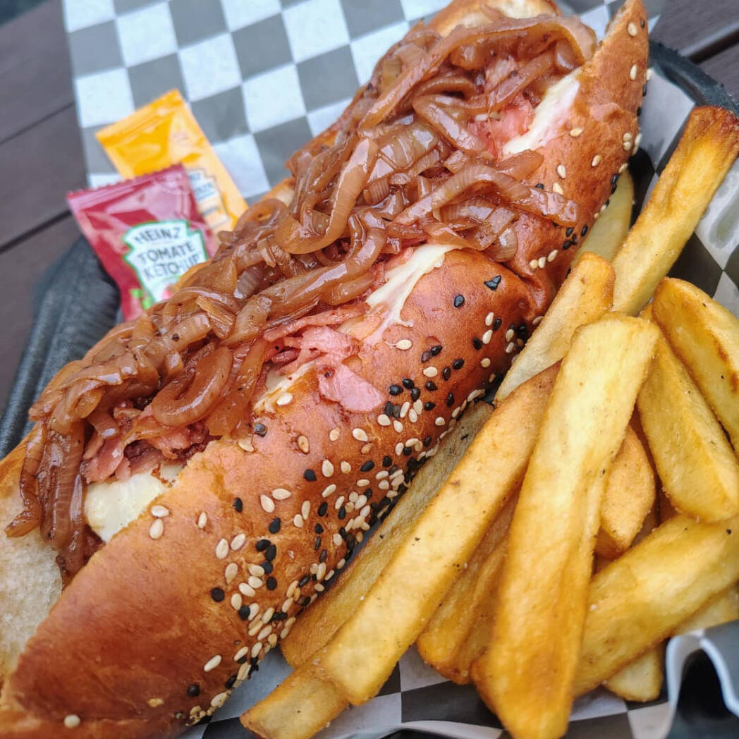 Pan artesanal, salchicha jumbo, mozarella fundido, tocino y cebolla caramelizada. Acompañado de papas fritas.