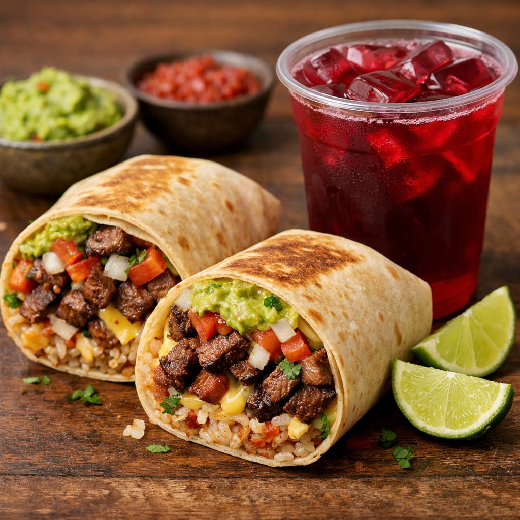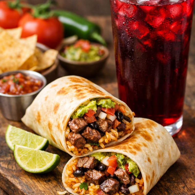 TORTILLA DE HARINA GRANDE, FRIJOLES, QUESOS MIXTOS DERRETIDOS, VERDURAS FRESCAS Y ARRACHERA MARINADA.