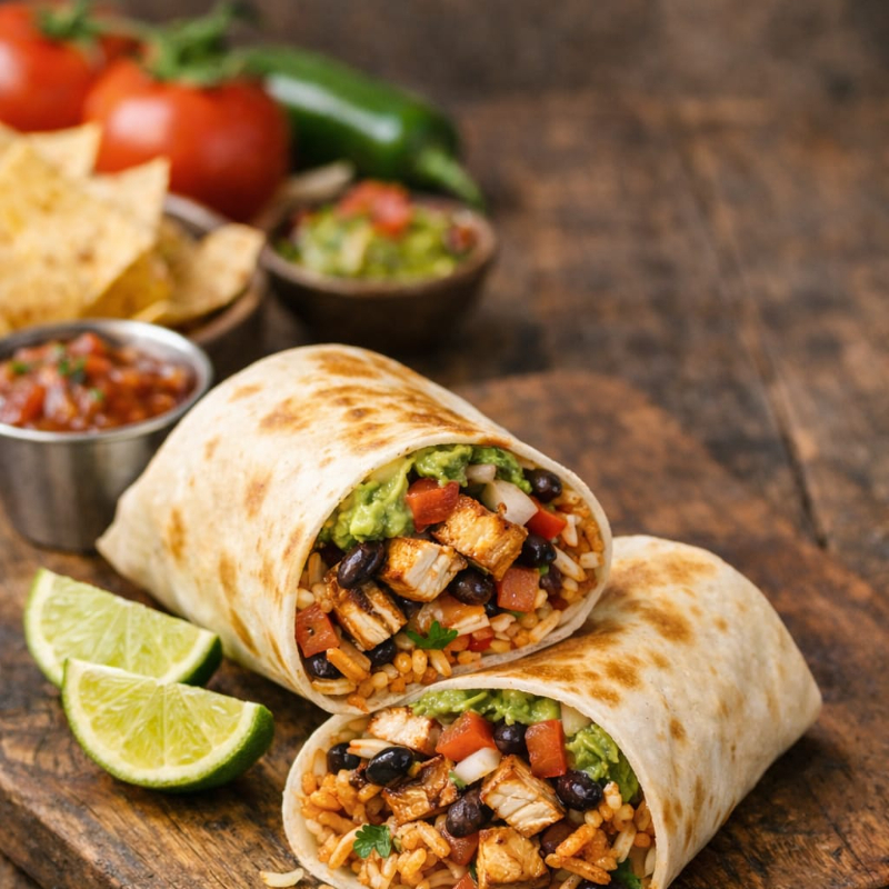 TORTILLA DE HARINA GRANDE, FRIJOLES, QUESOS MIXTOS DERRETIDOS, VERDURAS FRESCAS Y BONNELESS PICANTES