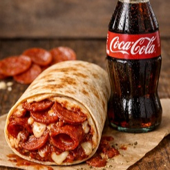Tortilla de harina grande, salsa de frijol, aderezo especial, quesos mixtos, verduraas frescas y pepperoni