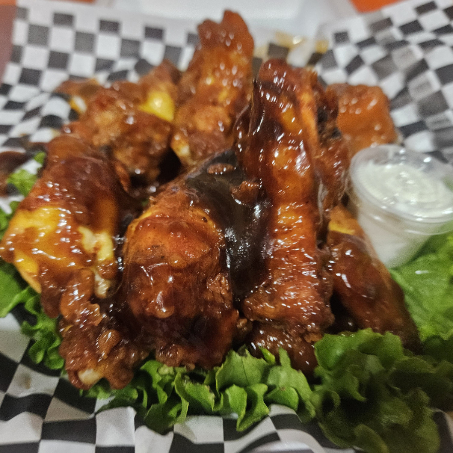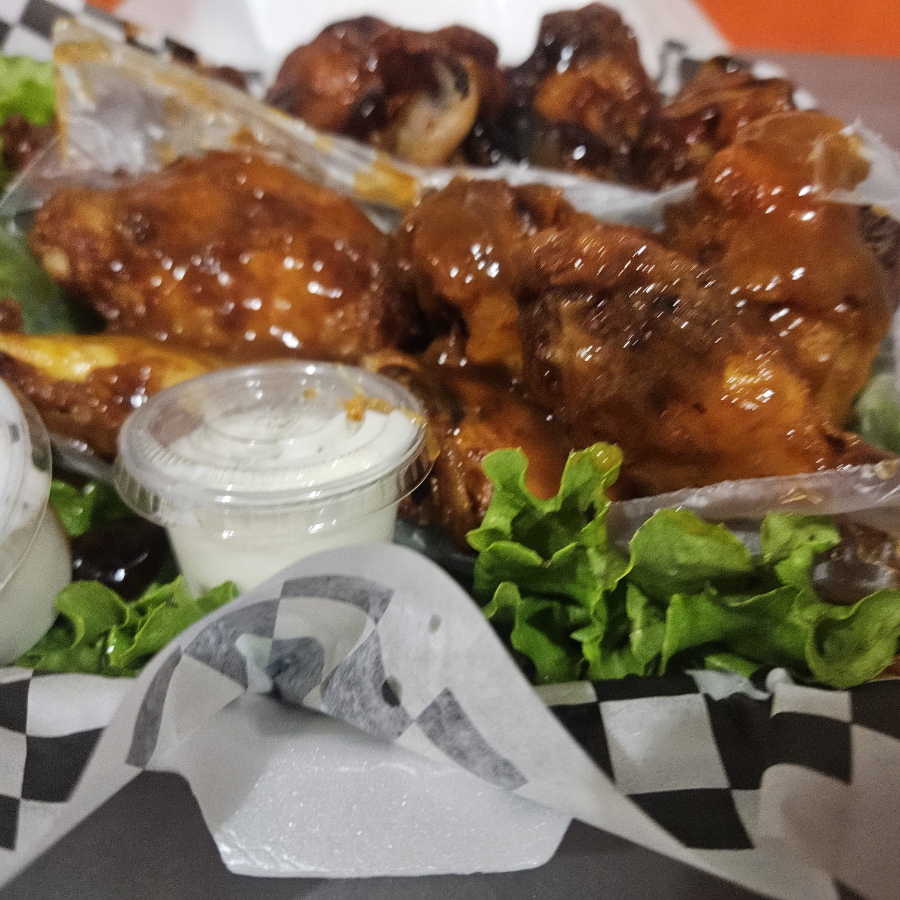 Orden de 24 alitas sobre una cama de lechuga italiana, bañada en su salsa favorita y acompañadas de 2 onzas de aderezo ranch