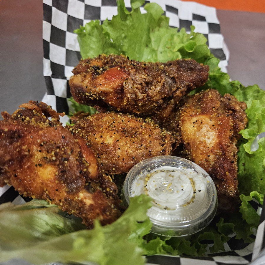 Orden de 6 alitas sobre una cama de lechuga italiana, bañada en su salsa favorita y acompañadas de 1 onza de aderezo ranch