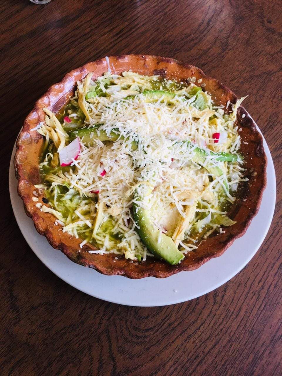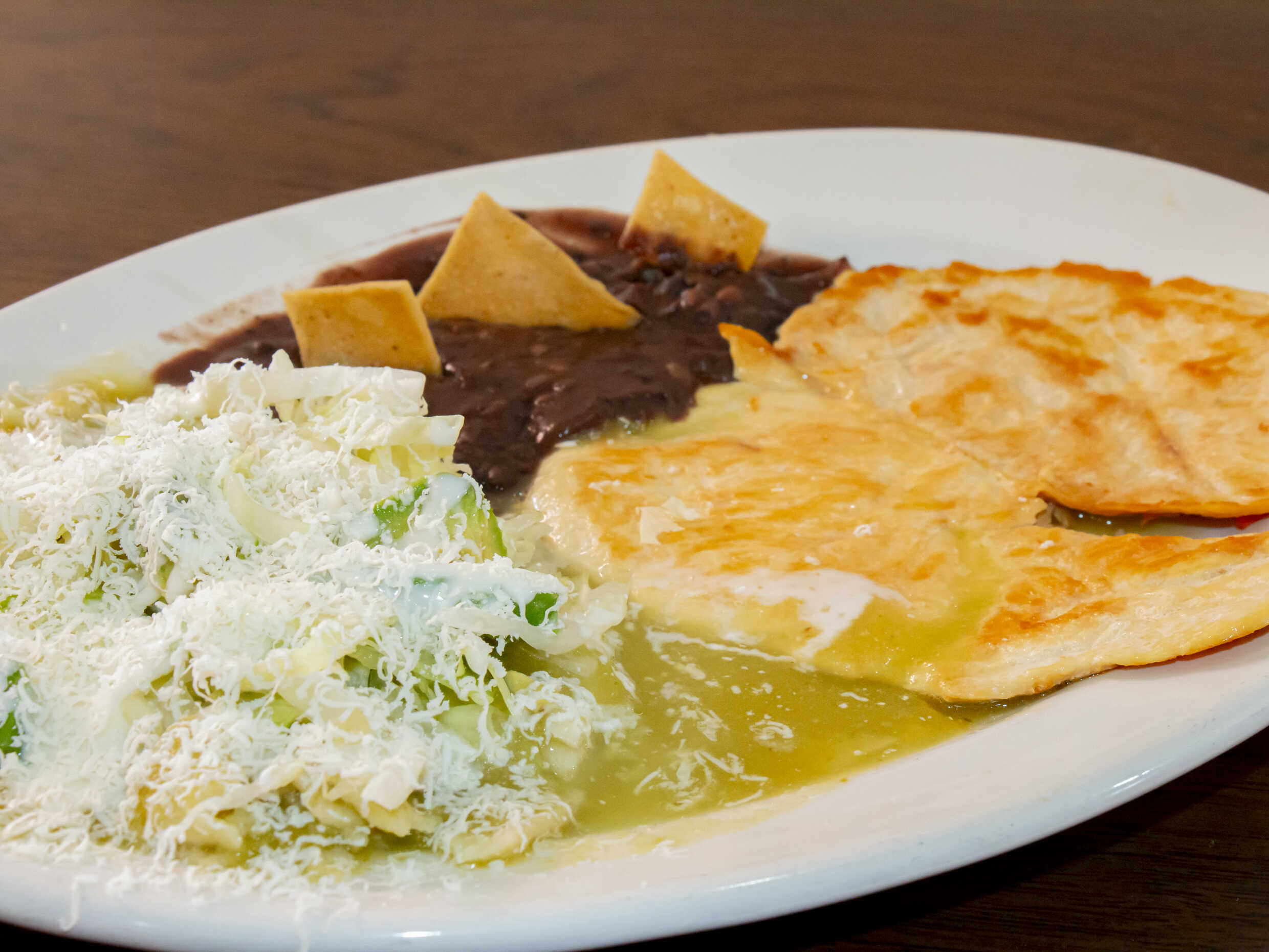 Frita con enchiladas verdes y frijoles refritos.
