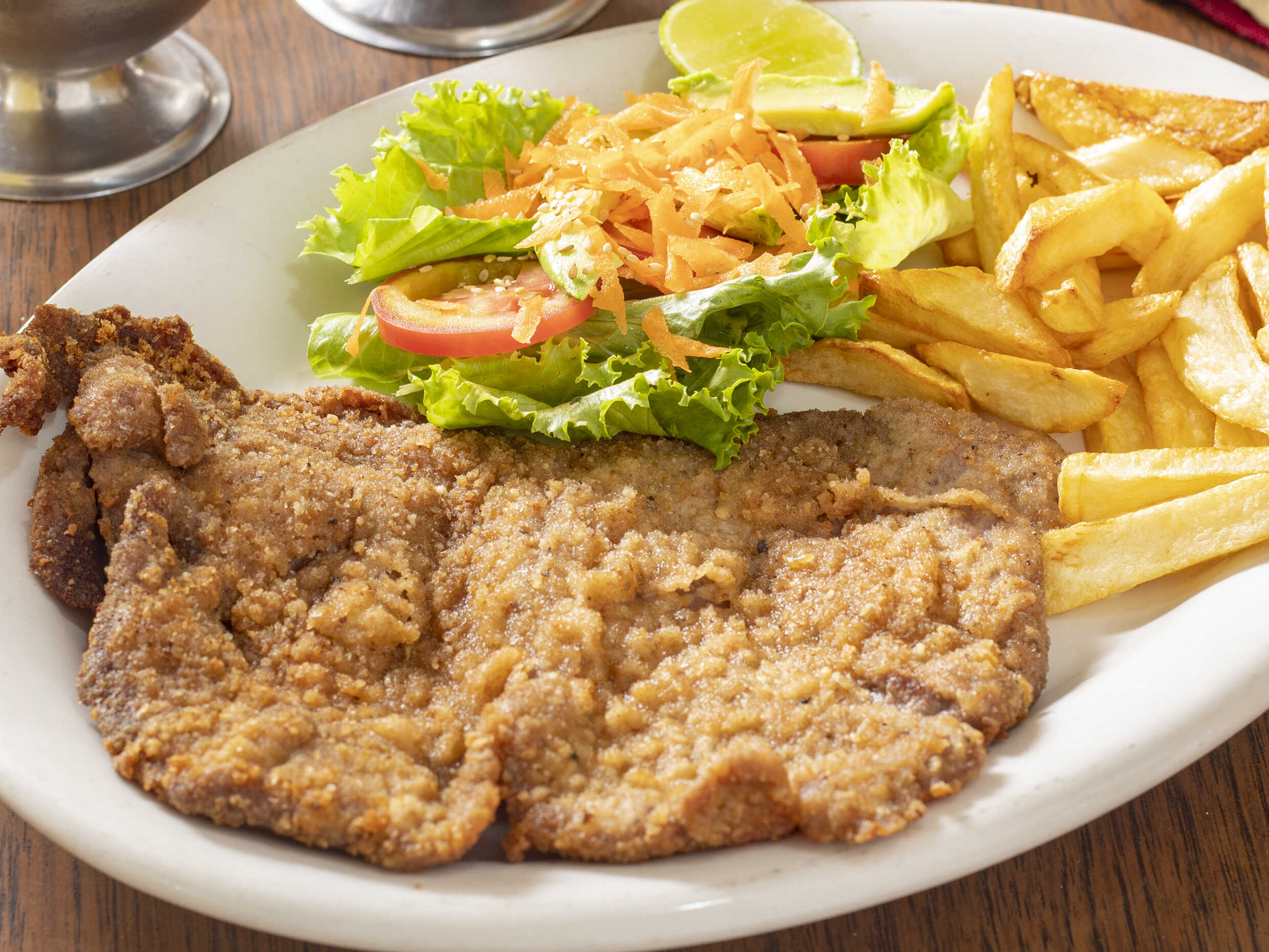 Filete empanizado con papas y ensalada.