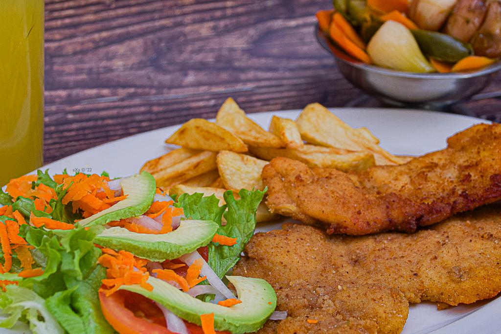 Filete de pechuga empanizado con papas a la francesa y ensalada.