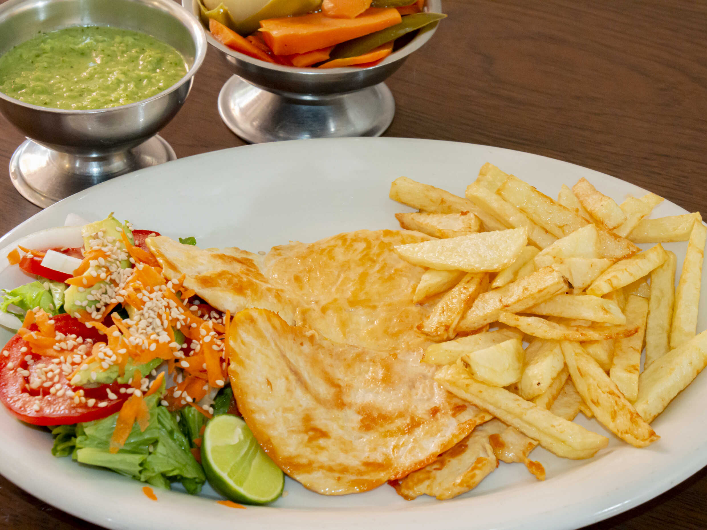 Con papas a la francesa, enchiladas verdes y frijoles refritos.