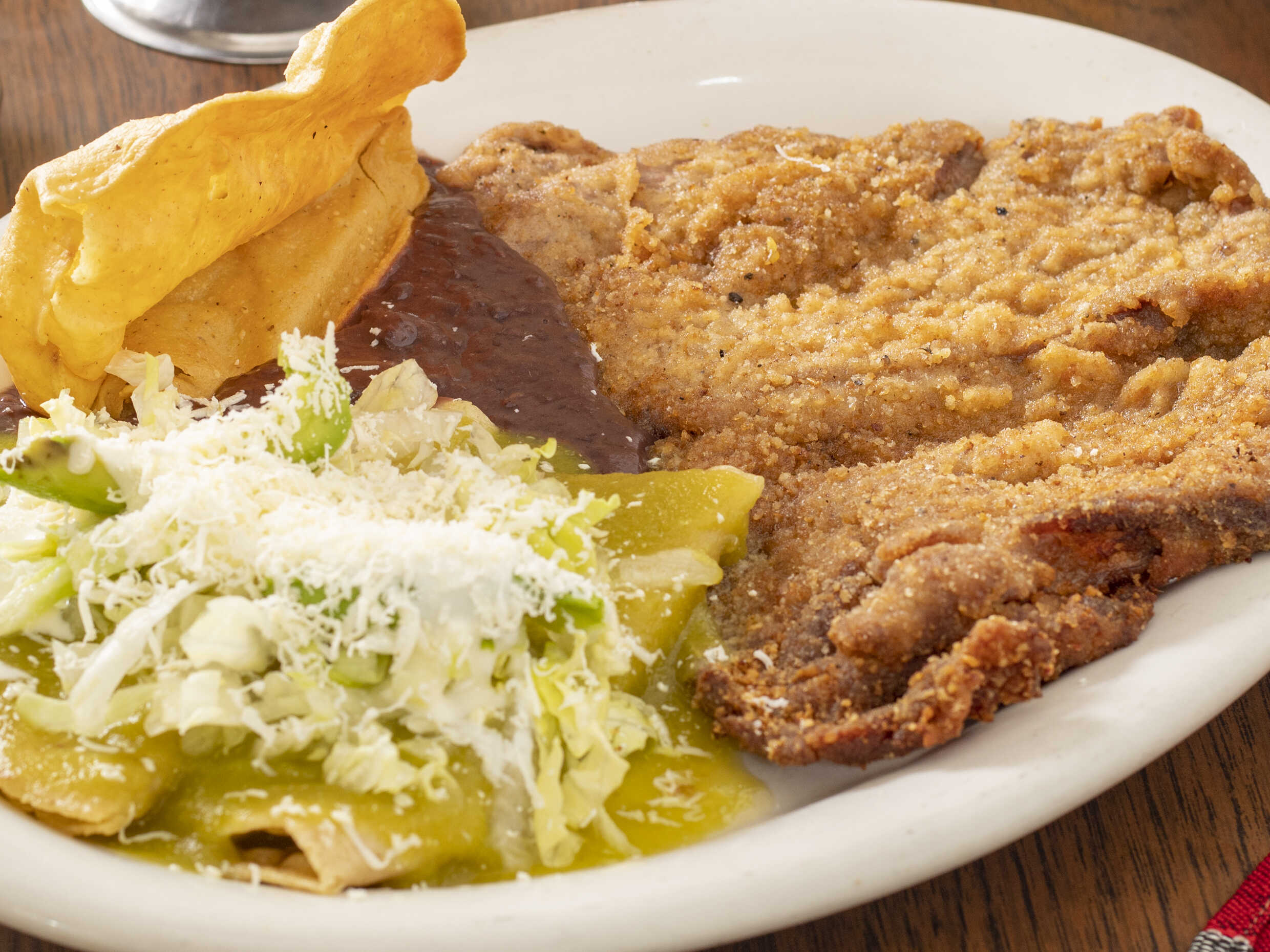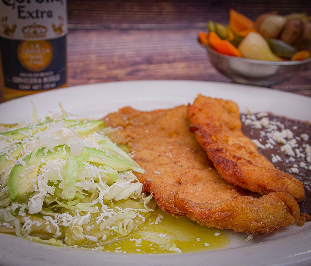 Milanesa de res con enchiladas verdes y frijoles refritos.