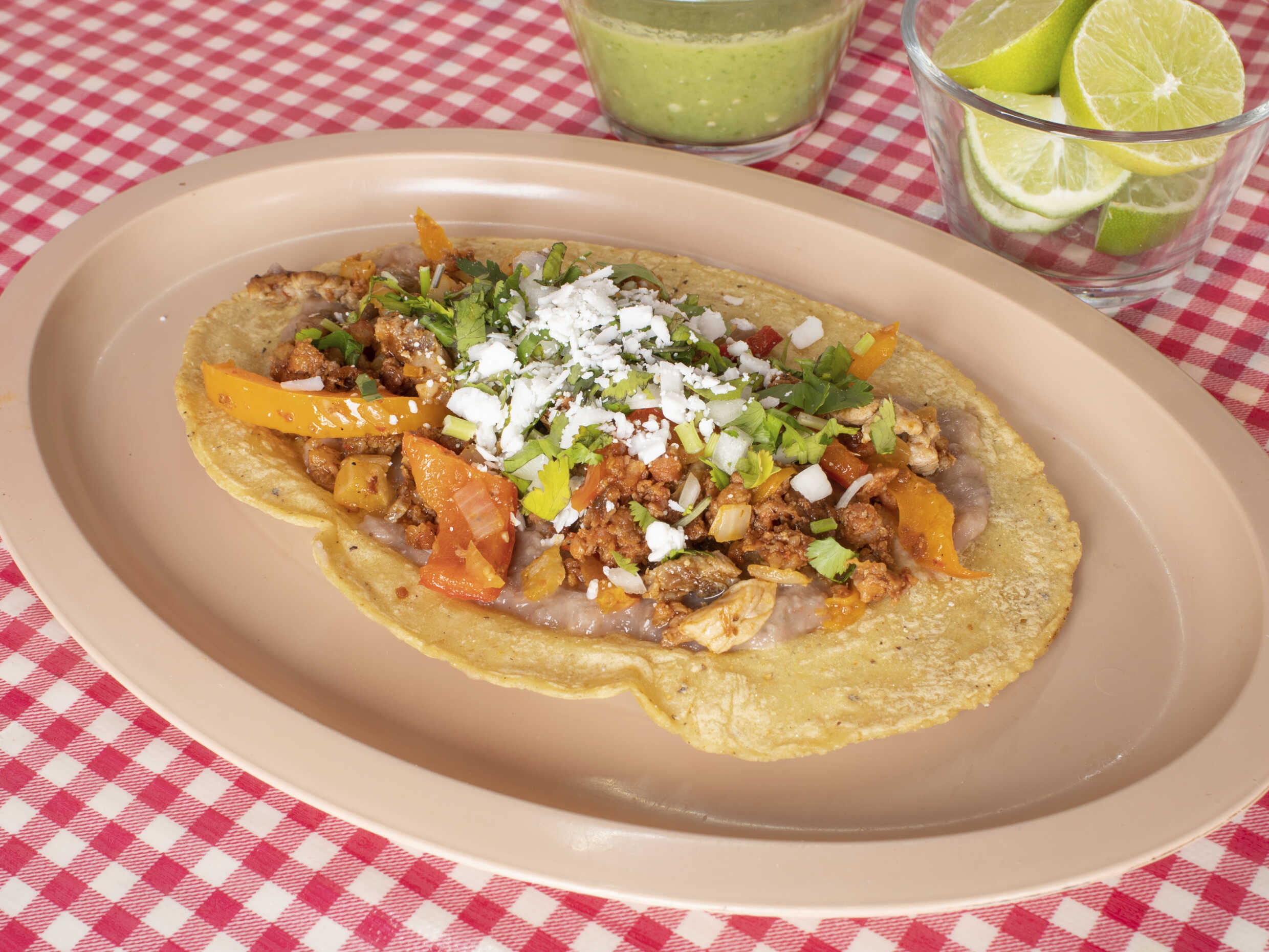 Tortilla de maíz recien echa de aprox. 20 cm. con una untada de frijoles refritos, acompañado de una combinacion de carne, pimiento, cebolla, longaniza, cebolla, cilantro recien picado y queso rallado.