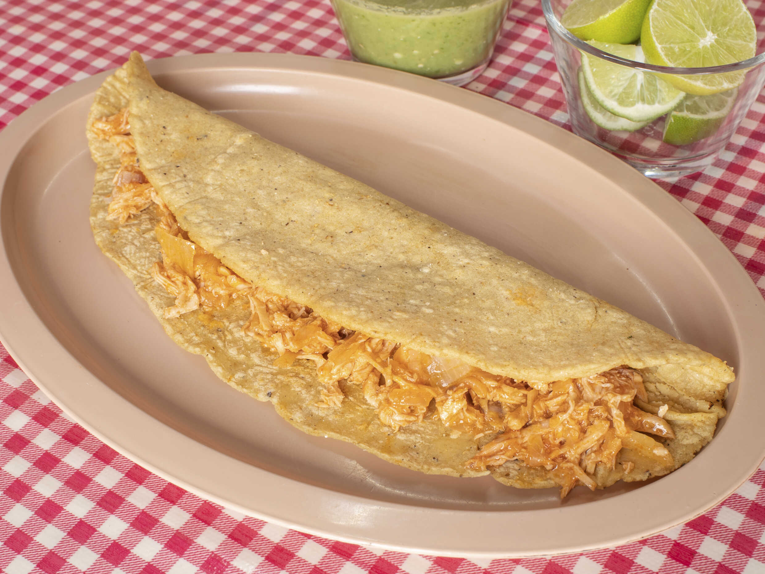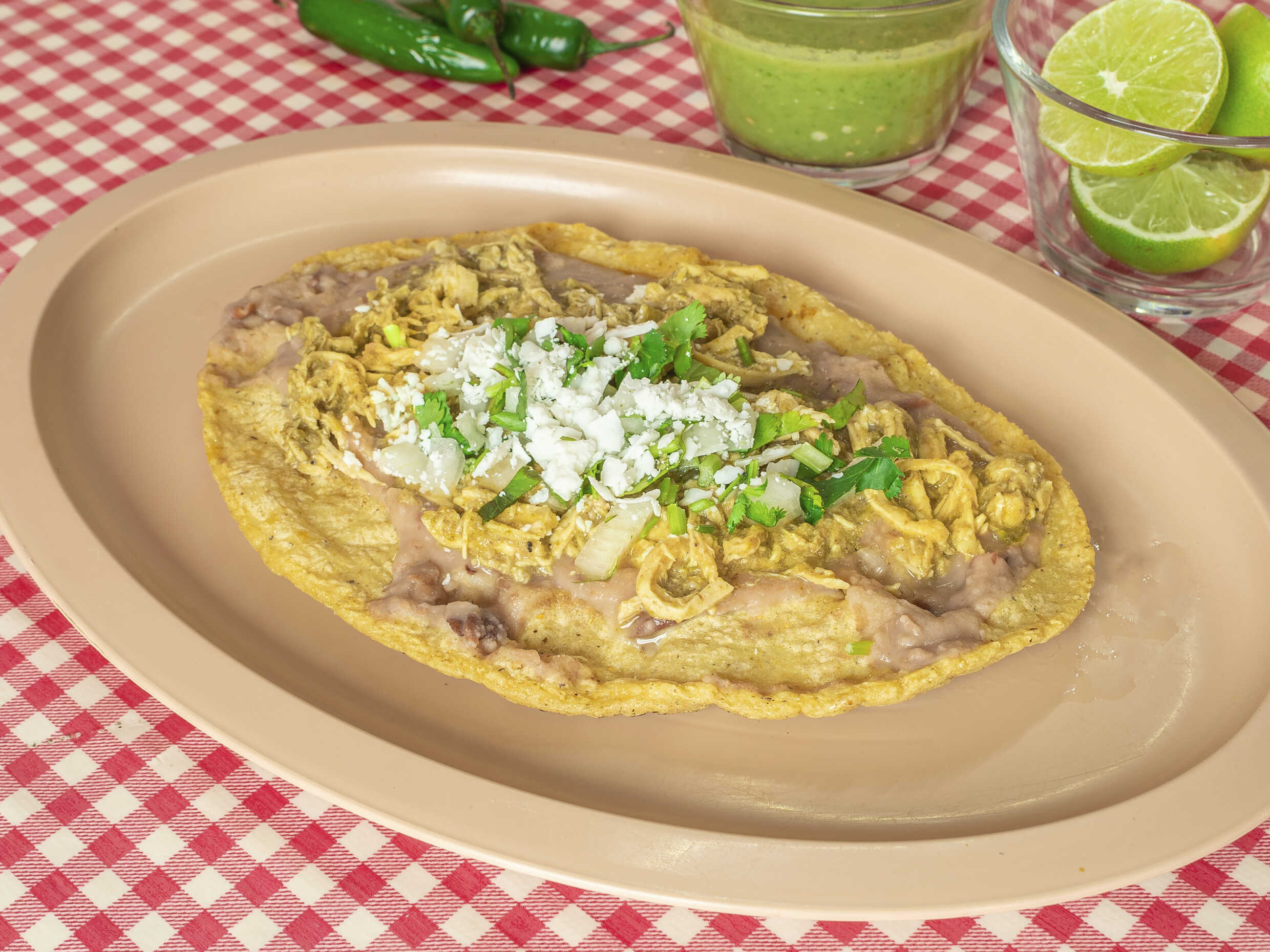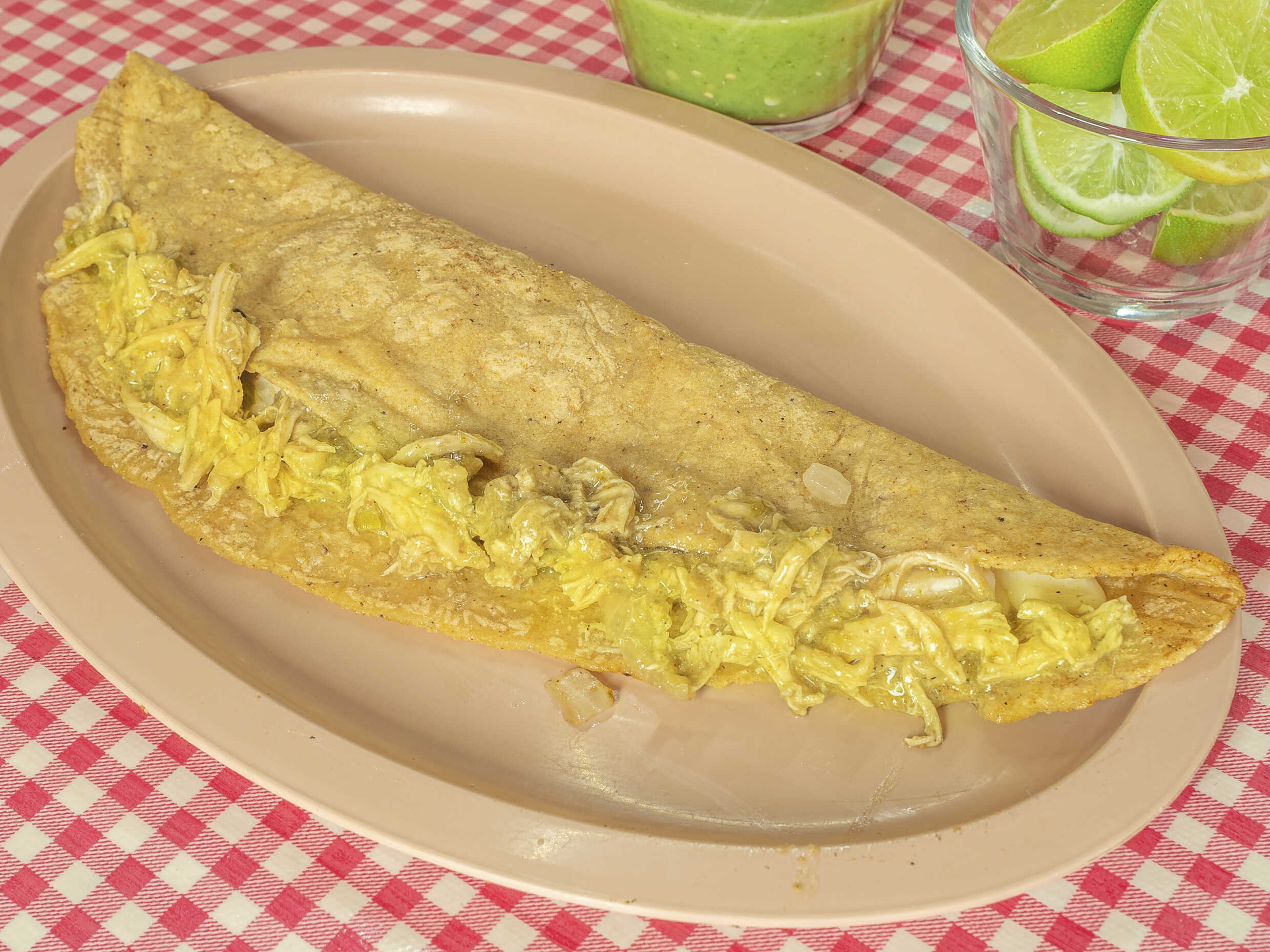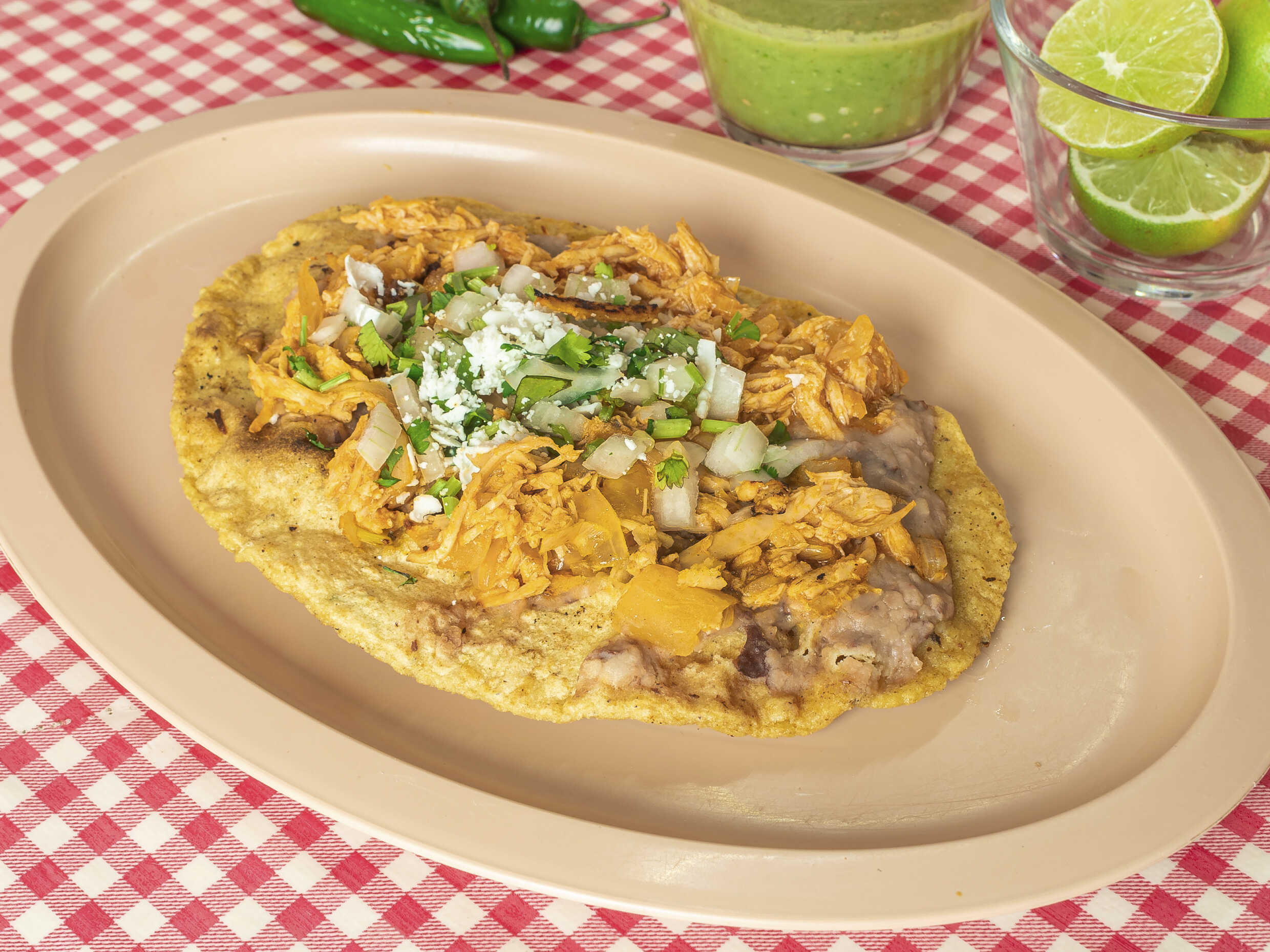 Tortilla de maíz recien echa de aprox. 20 cm. con una untada de frijoles refritos, acompañado del original mele verde de pollo, cebolla, cilantro recien picado y queso rallado.