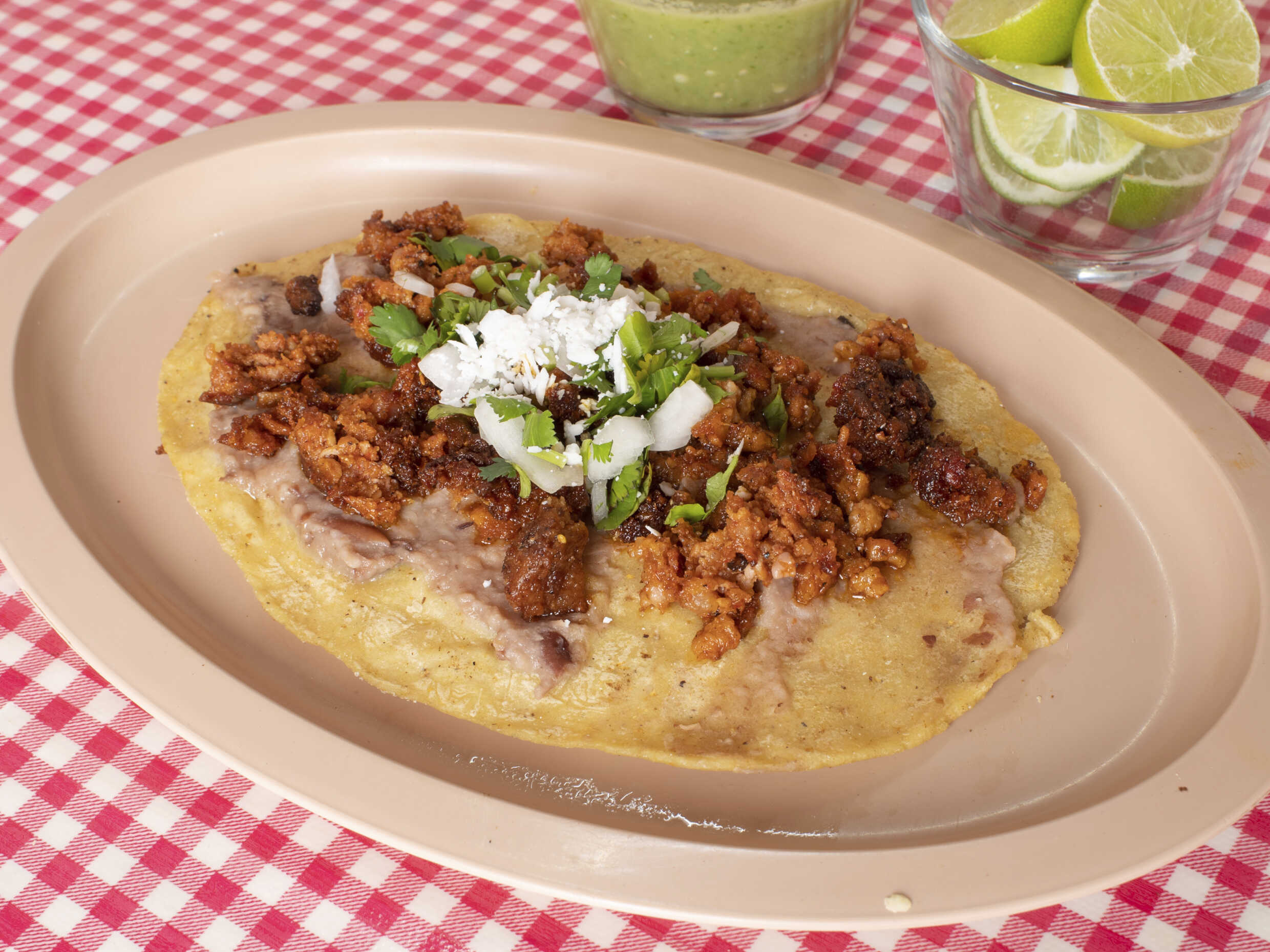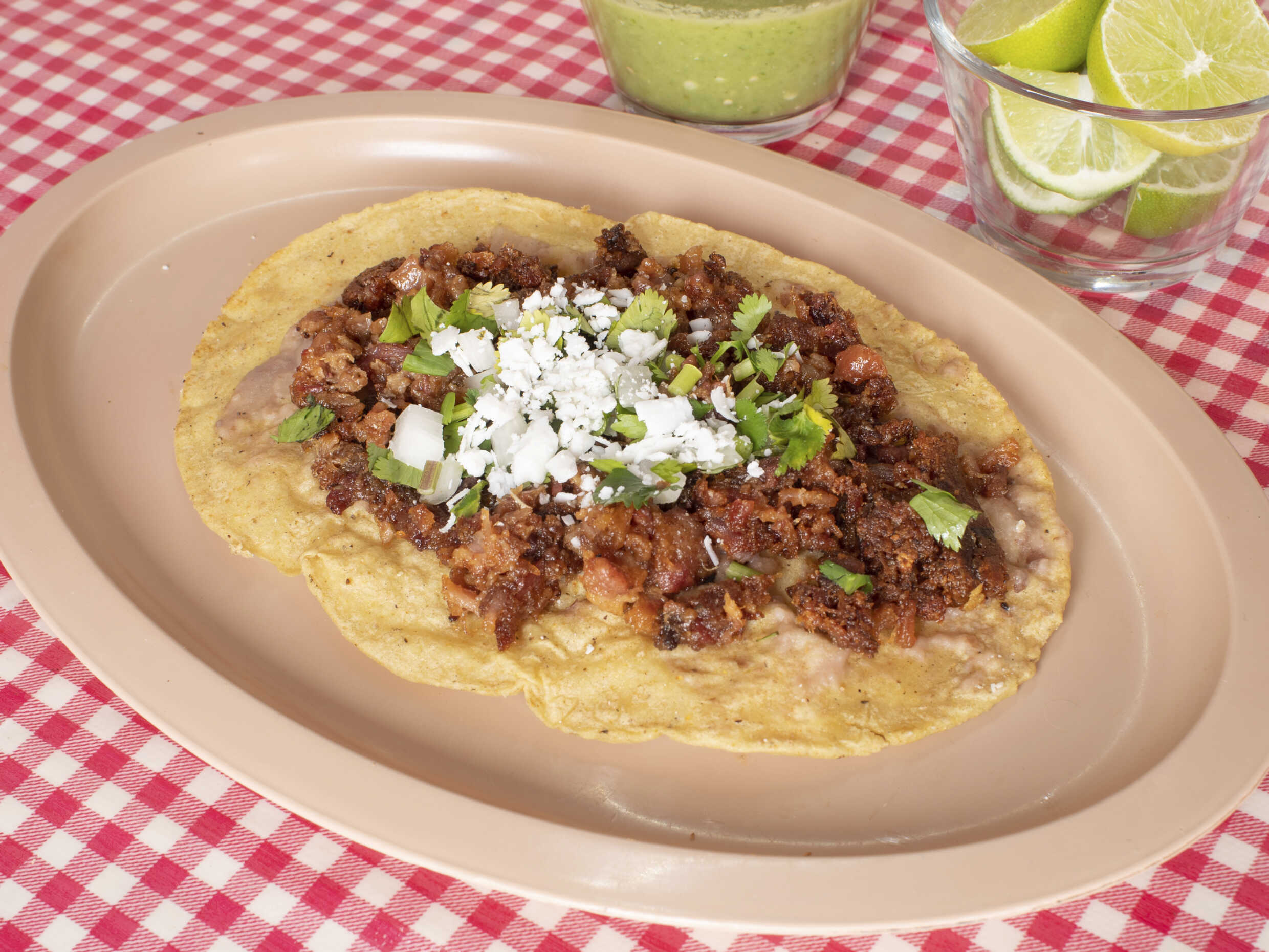 Tortilla de maíz recien echa de aprox. 20 cm. con una untada de frijoles refritos, acompañado tierritas de cerdo, cebolla, cilantro recien picado y queso rallado.