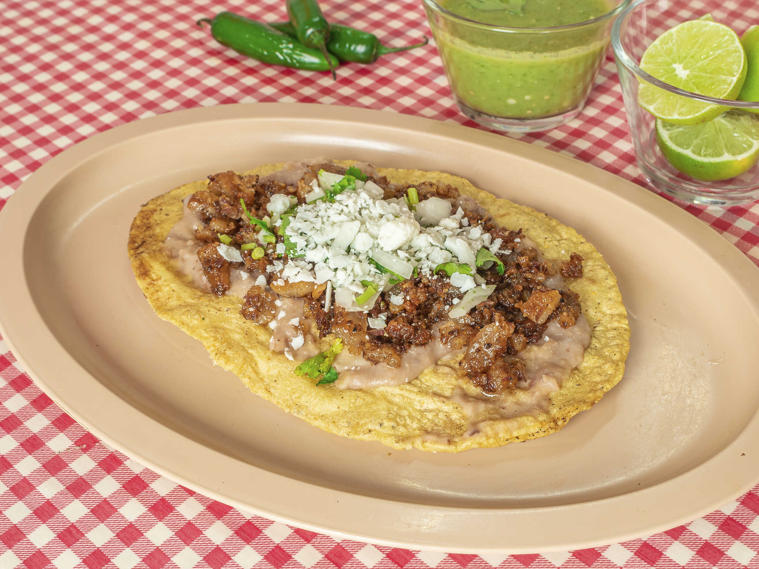 Tortilla de maíz recien echa de aprox. 20 cm. con una untada de frijoles refritos, acompañado chicharrón prensado, cebolla, cilantro recien picado y queso rallado.
