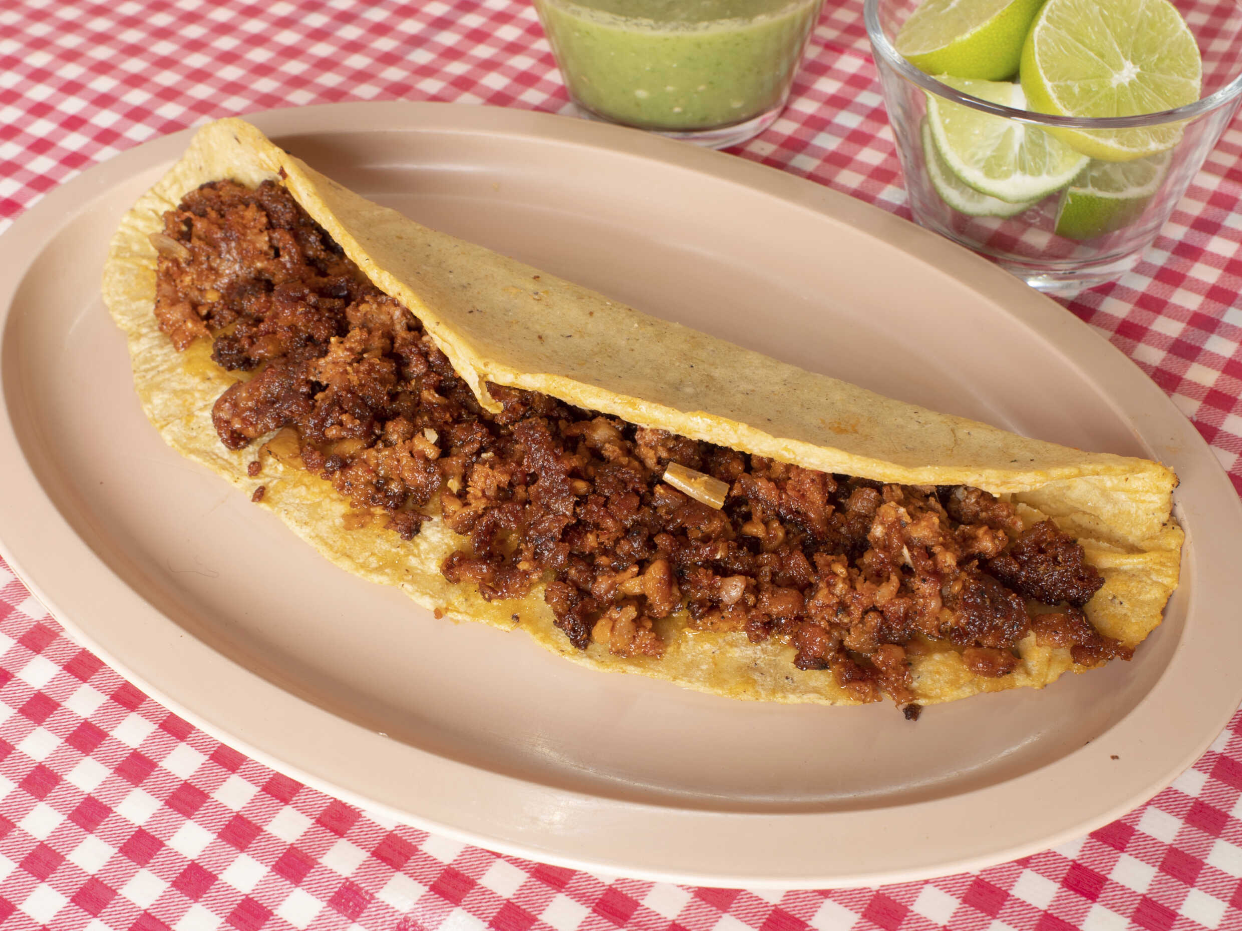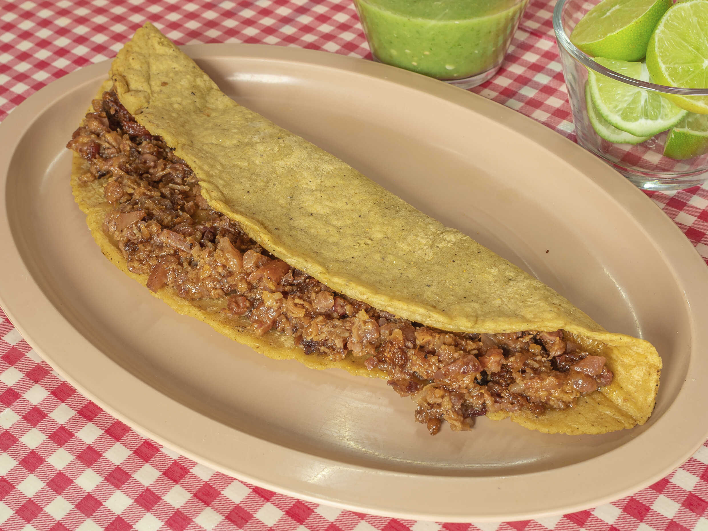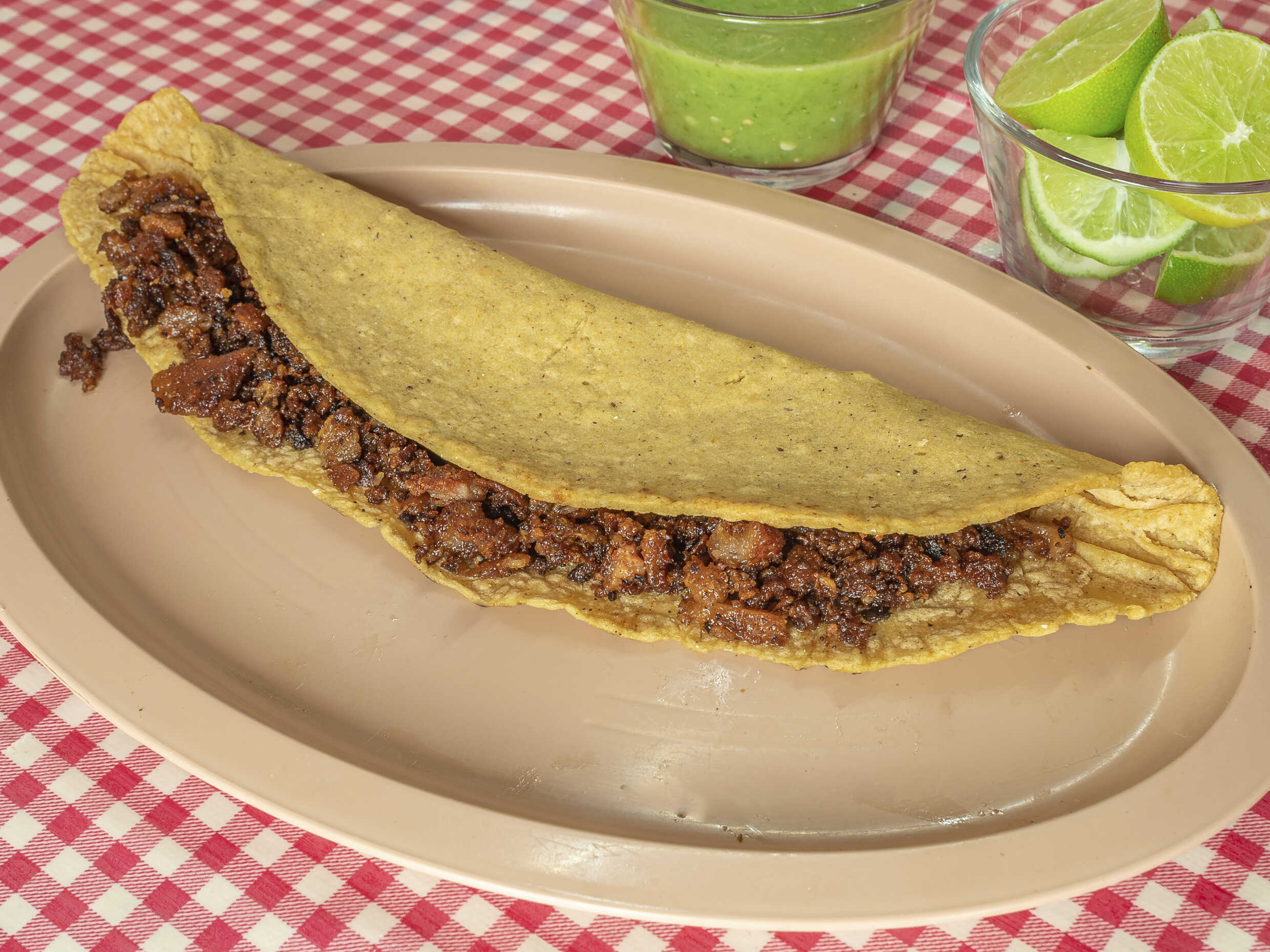 Tortilla de maíz recien echa de 25cm, rellena de chicharron prensado sazonado con un toque especial.
