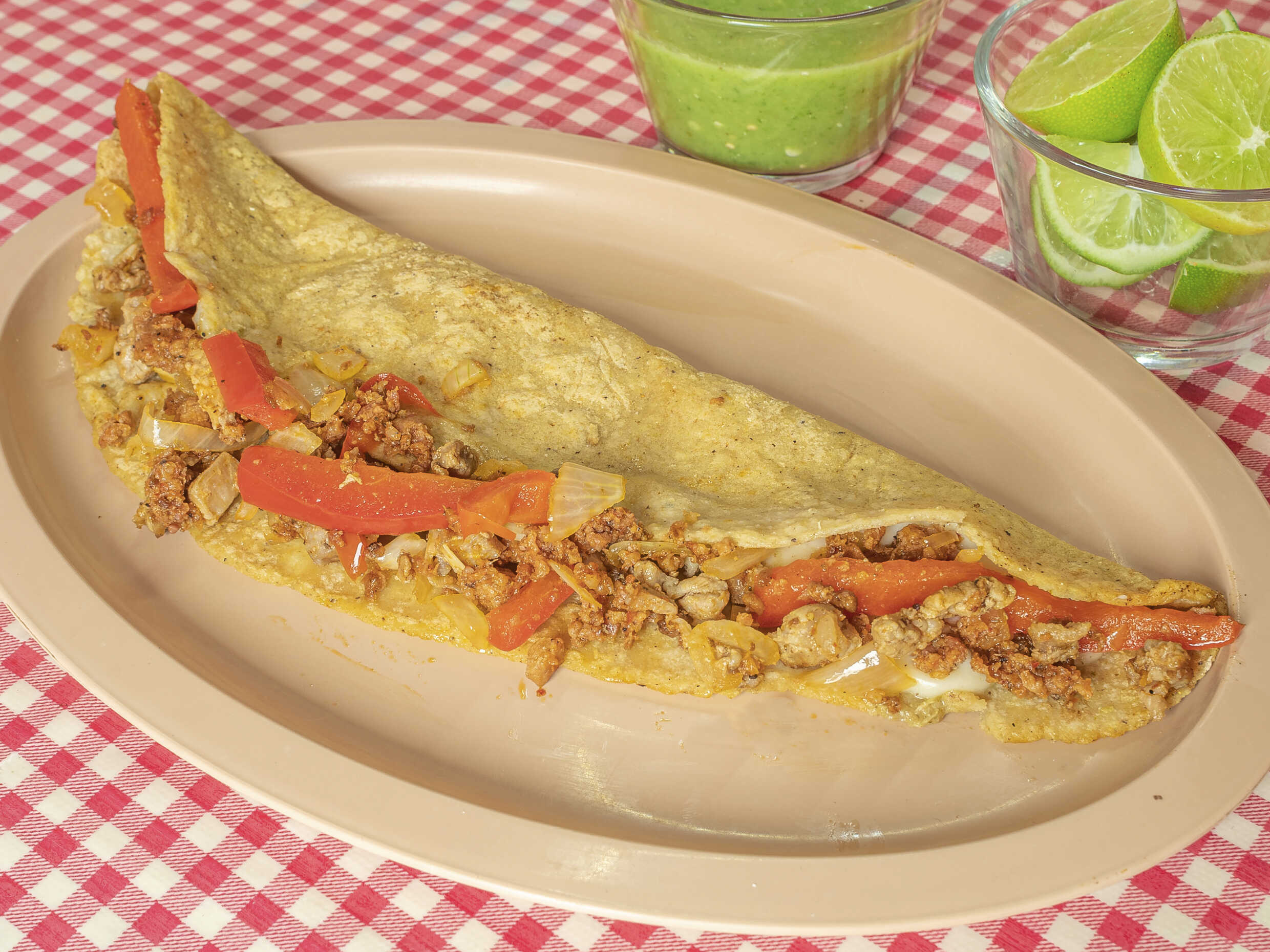 Torilla de maíz recien echa de 25cm, rellena de una rica combinacion de carne de cerdo, cebolla, pimiento y longaniza.
