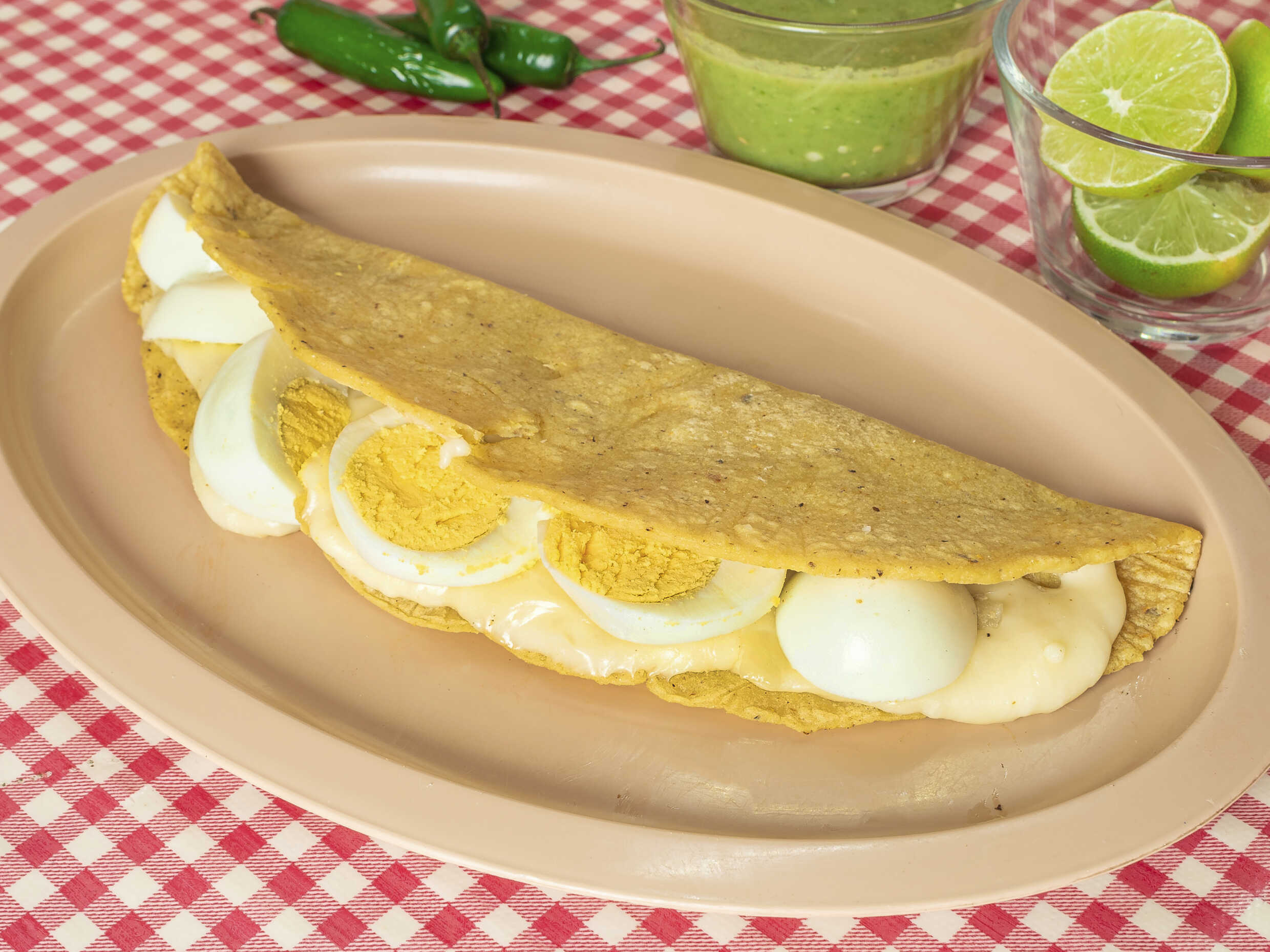 Tortilla de maíz recien echa de 25cm, rellena de huevo duro fresco con un toque de queso oaxaca.