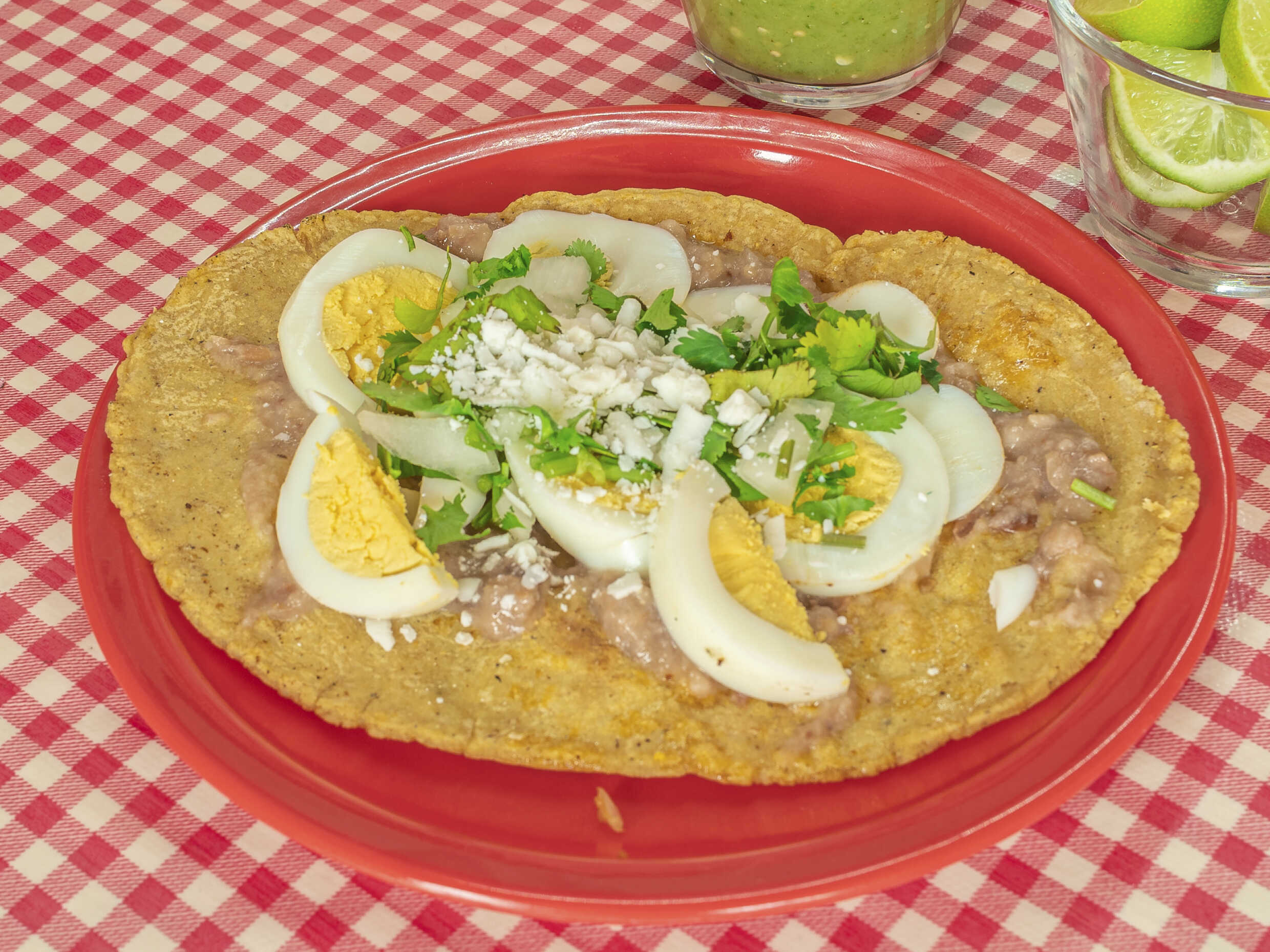 Tortilla de maíz recien echa de aprox. 20 cm. con una untada de frijoles refritos, acompañado huevo duro, cebolla, cilantro recien picado y queso rallado.
