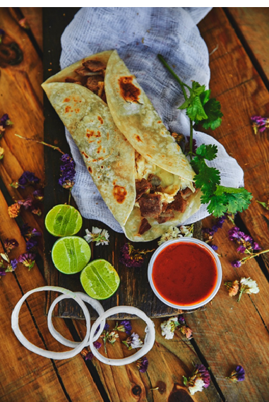 Tortilla de harina 17 cm con bistec, pimiento morrón, tocino, cebolla, queso y frijoles.