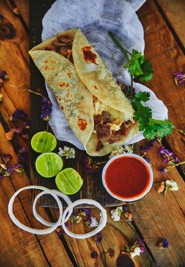 Tortilla de harina 17 cm con bistec, queso y frijoles.