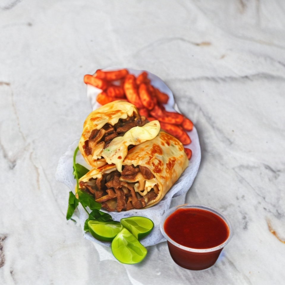 Burrito envuelto en tortilla de harina 28 cm con arrachera, pimiento morrón, tocino, cebolla, queso y frijoles.