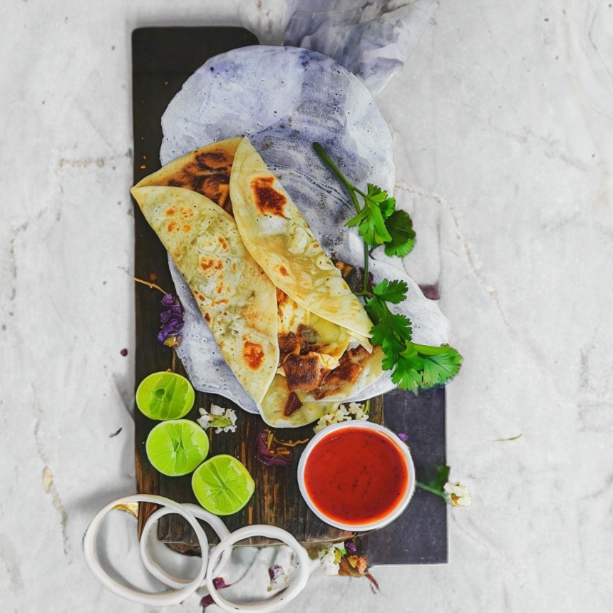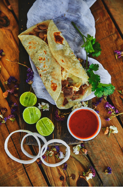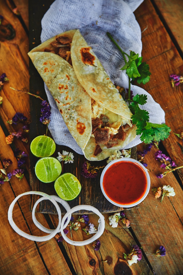 1 tortilla de harina, con arrachera 150 Gm, queso 70Gm, frijoles 40Gm, Papas en casco 18Gm (Salsas y limón por separado)