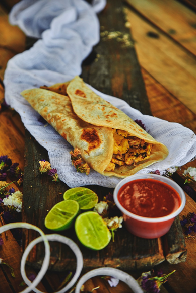 Tortilla de harina 17 cm con filete de pechuga, queso y frijoles.