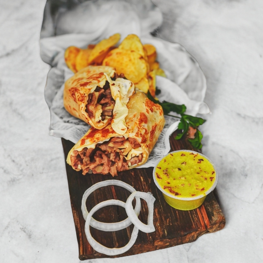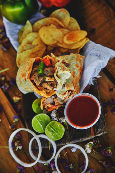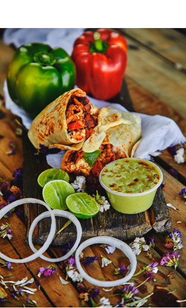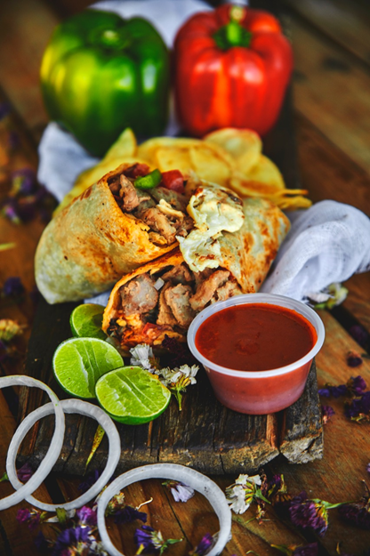 Burrito envuelto en tortilla de harina 28 cm con filete de pechuga, pimiento morrón, tocino, cebolla, queso y frijoles.