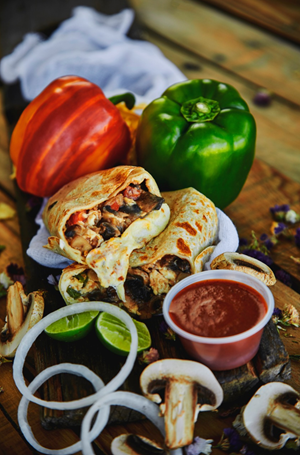 Burrito envuelto en tortilla de harina 28 cm con champiñón, pimiento morrón, cebolla, queso y frijoles.