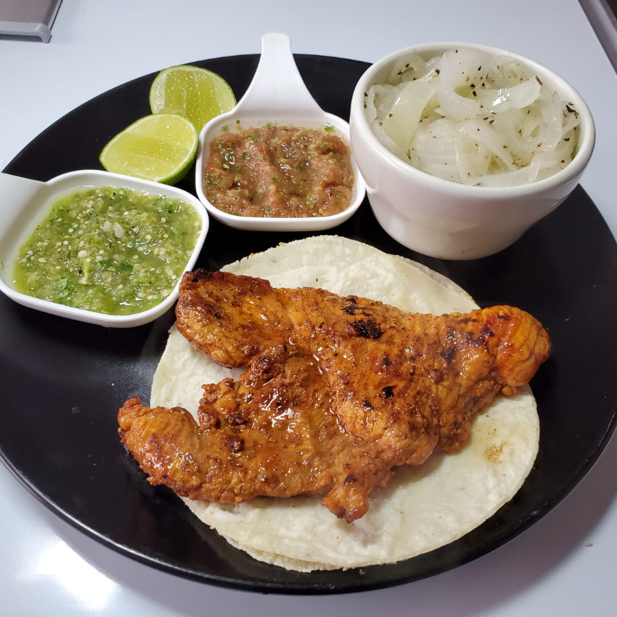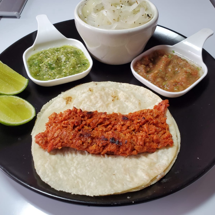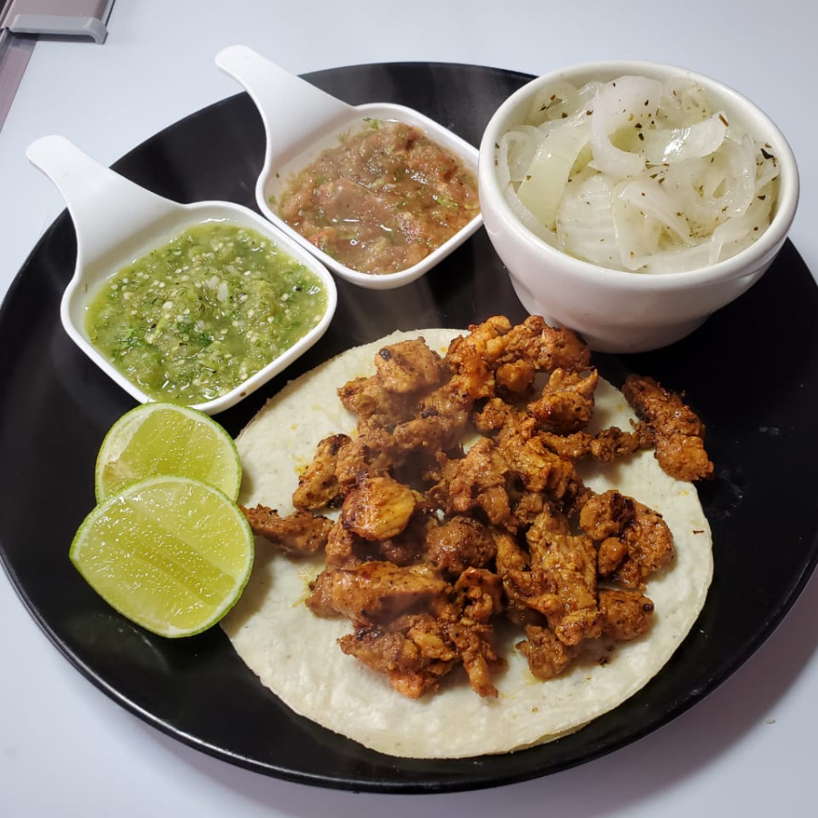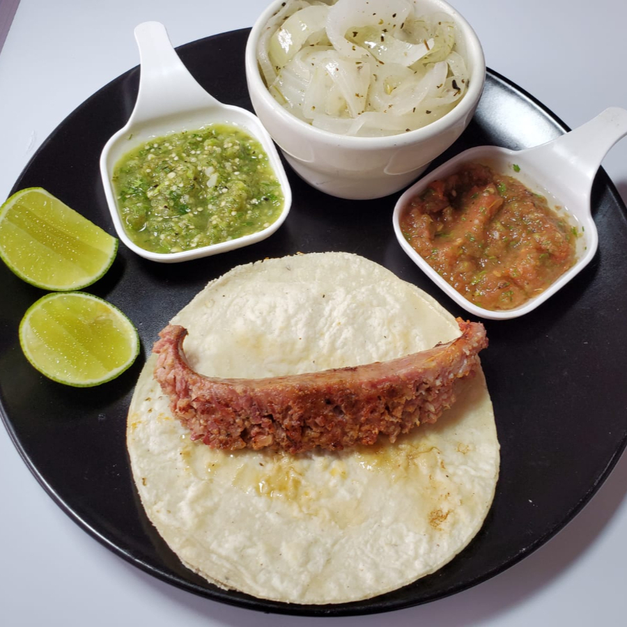 Taco con carne al pastor 80grms con doble tortilla acompañado de cebollas caramelizadas y salsa a elegir.