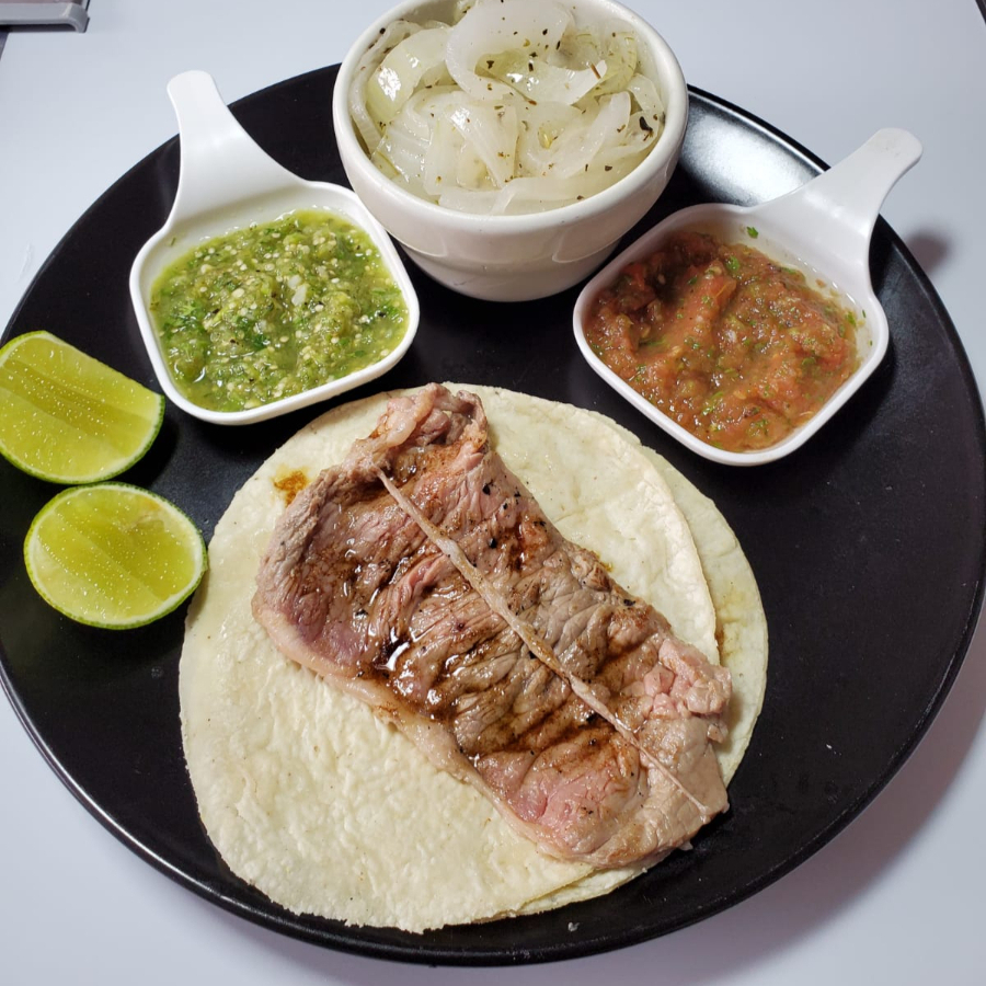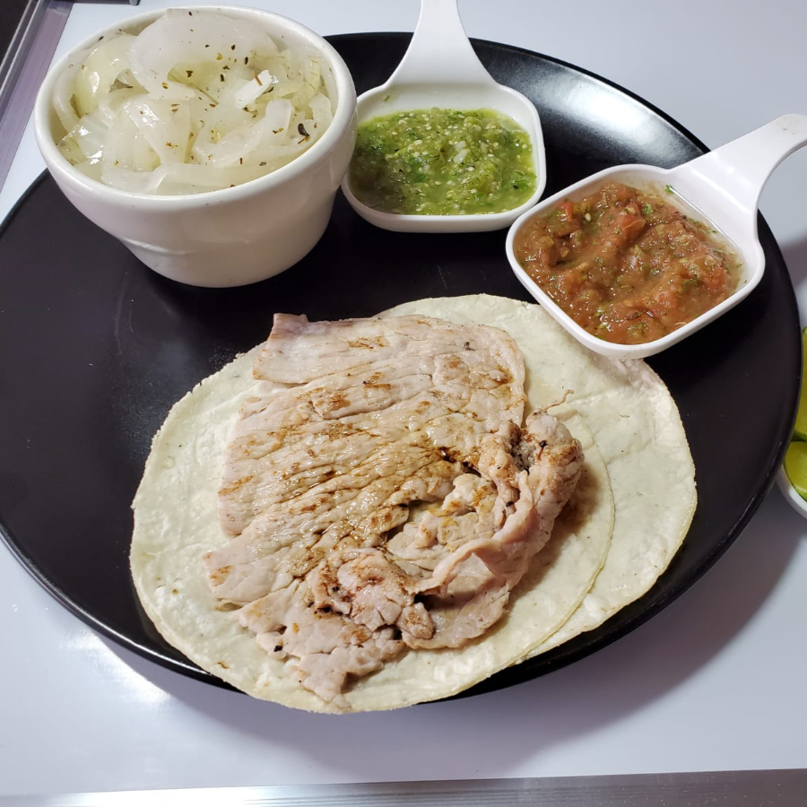 Taco de bistec de cerdo 65grms con doble tortilla, cebollas caramelizadas y salsa a elegir