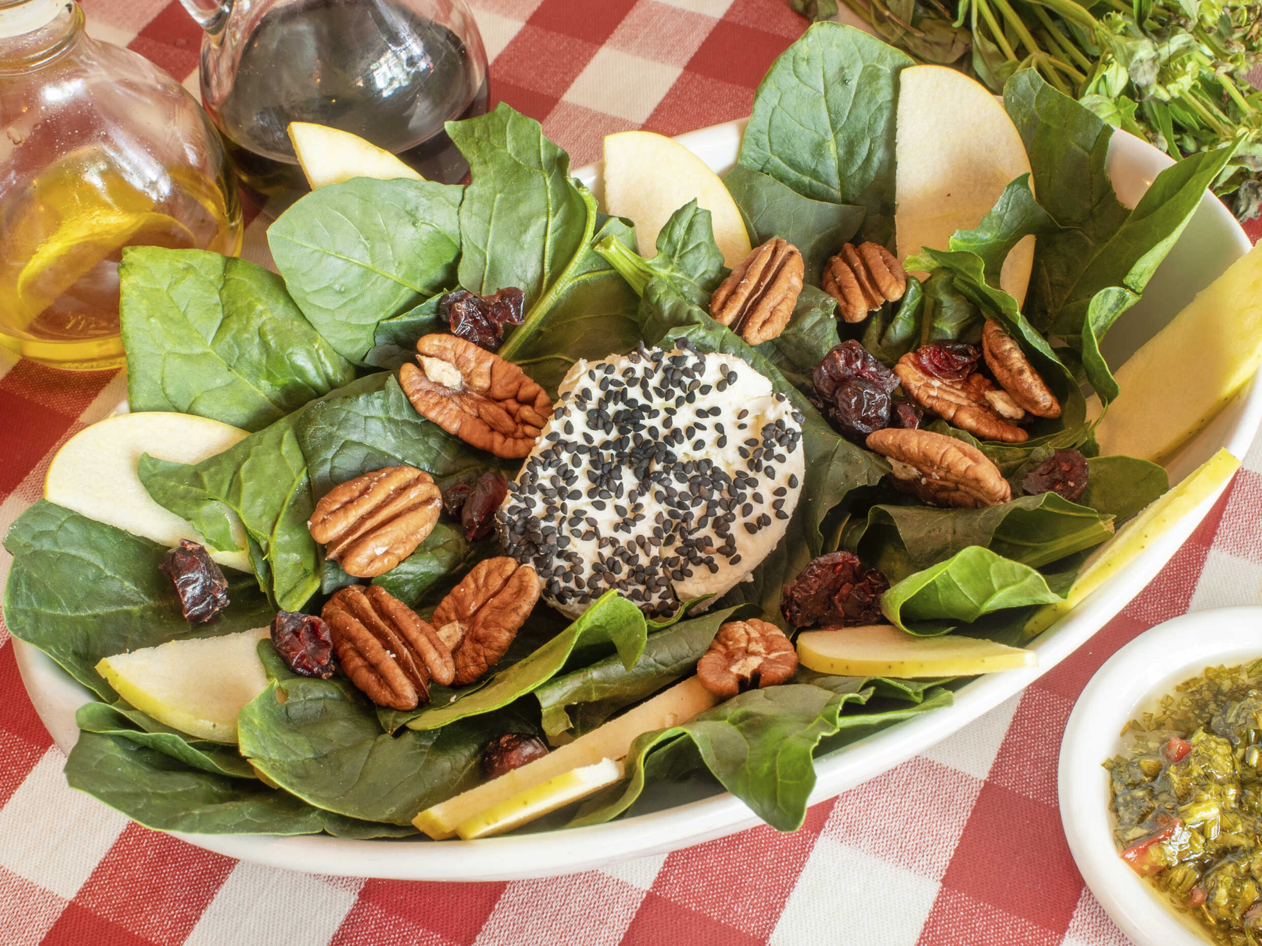 Espinaca, melón, manzana, queso de cabra, nuez, arándanos y aderezo de balsámico con miel.