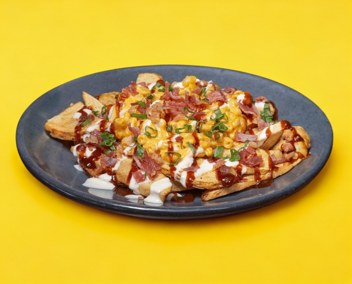 100 gramos de mac & cheese, 400 gramos de papa natural, tocino, salsa BBQ, aderezo de queso, cebollín.