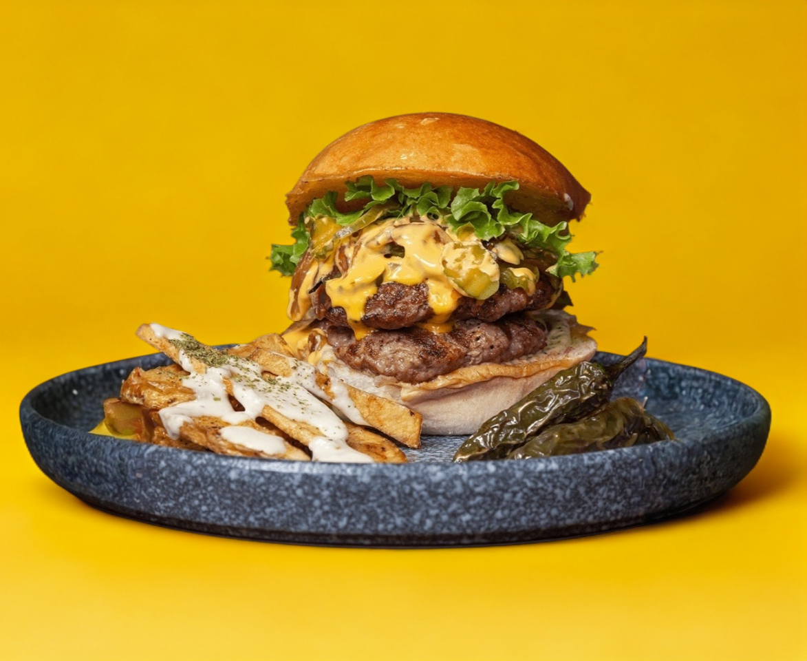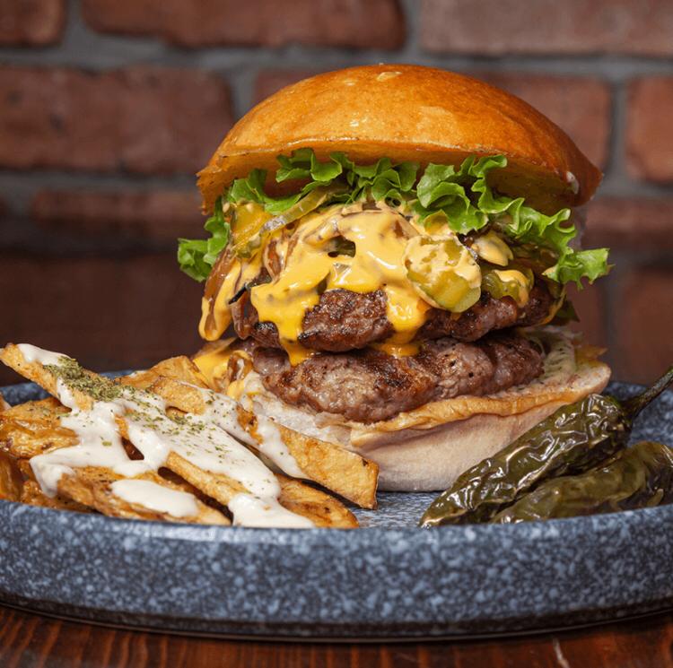 200 gramos de carne de res + queso cheddar + pepinillos + cebolla salteada + mayonesa de la casa + lechuga. Acompañada con papas gajo y chiles toreados.