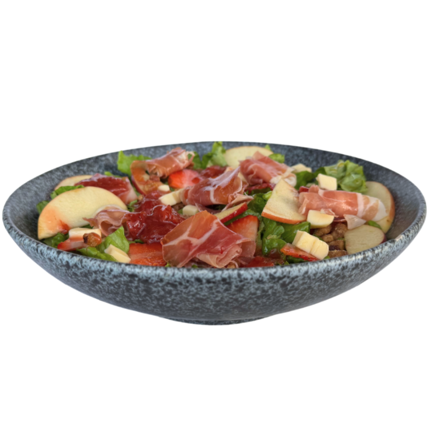 Jamón serrano, queso gouda, miel, blueberry , arándano , manzana , nuez caramelizada , lechuga , aderezo de fresa.