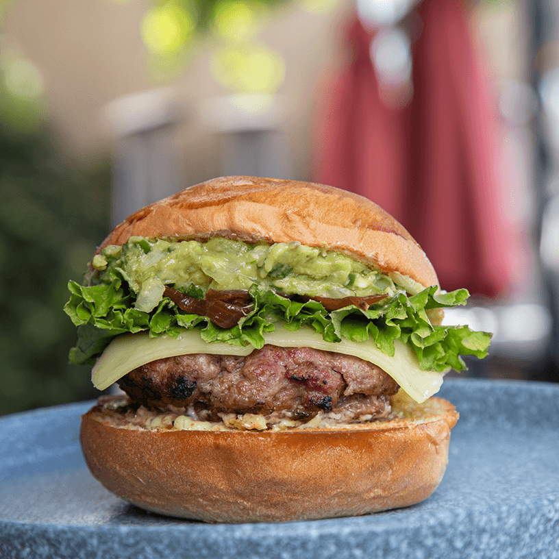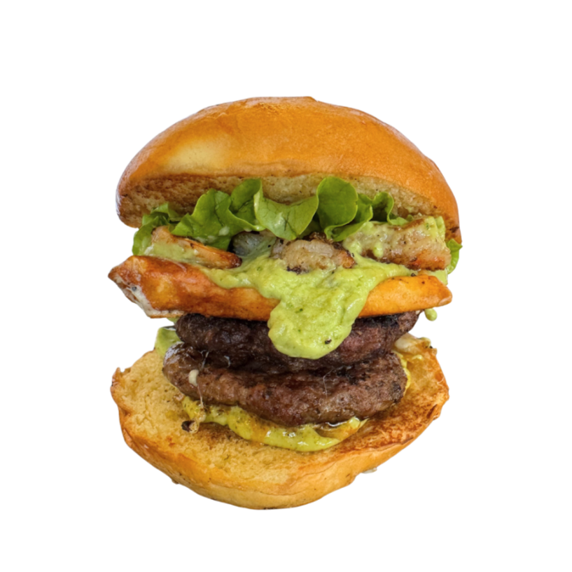 200 gramos de carne de res + guacamole + tocino + queso gouda + cebolla salteada + mayonesa de la casa + lechuga. Acompañada con papas gajo y chiles toreados.